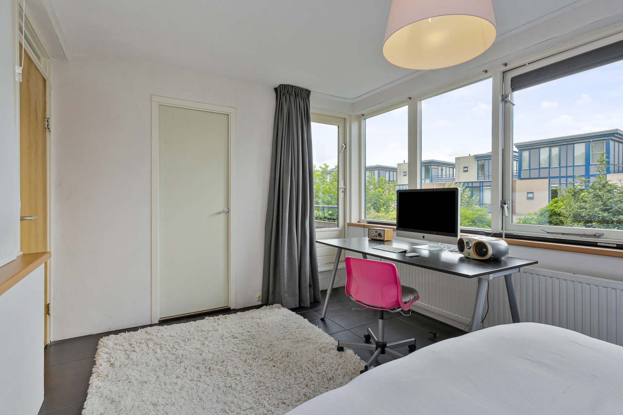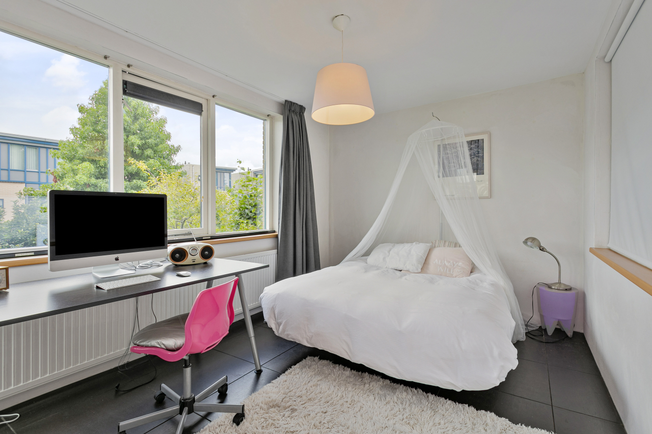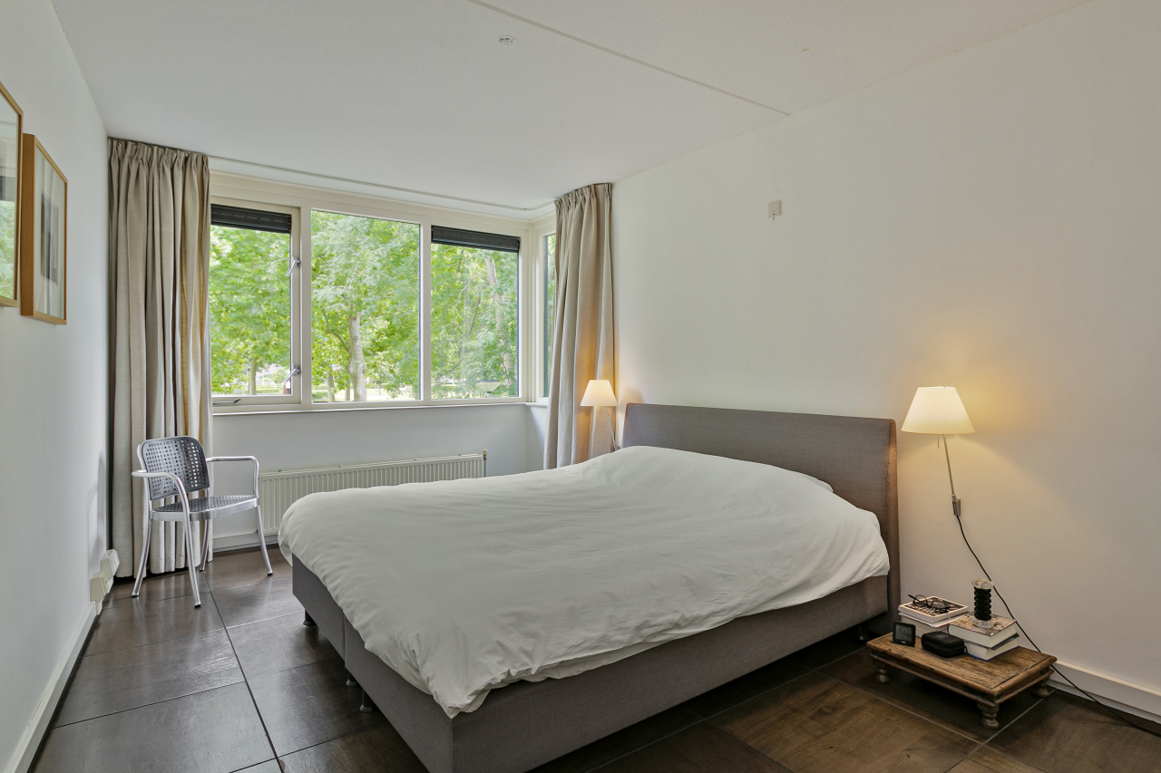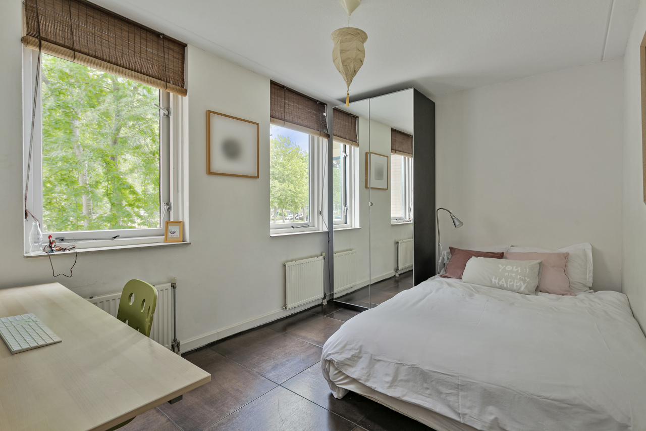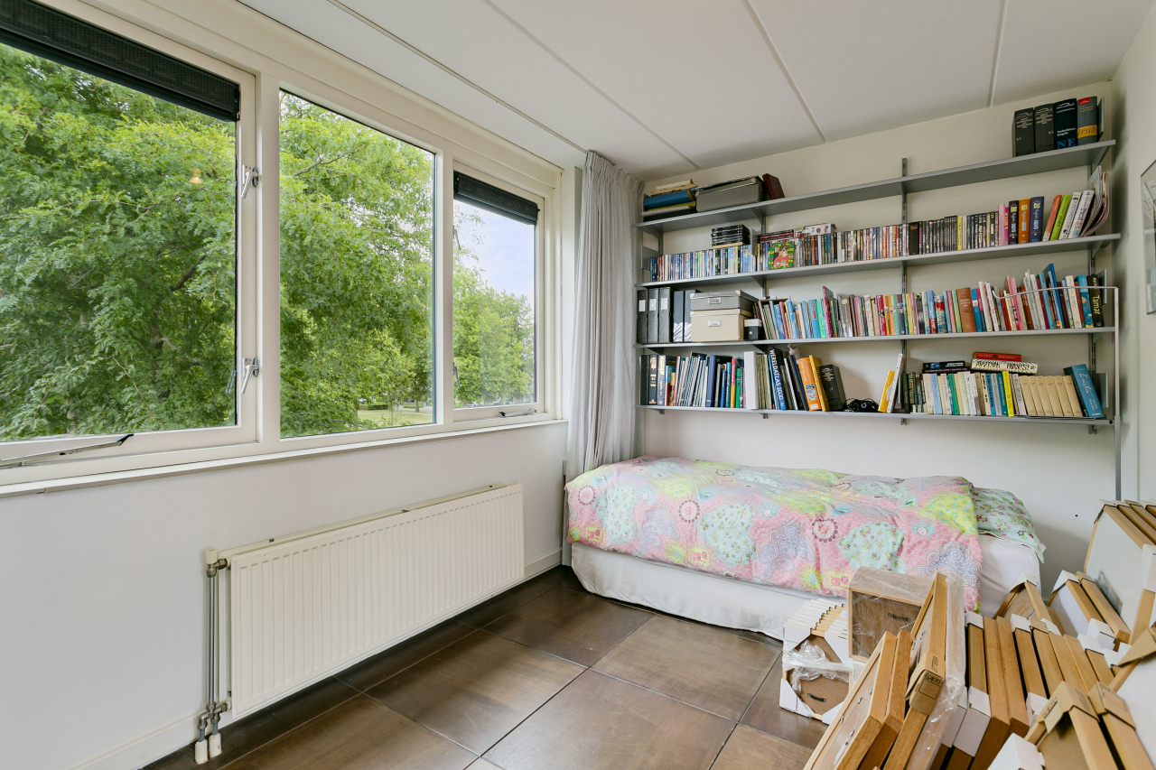 Aan de voorzijde liggen 2 ruime slaapkamers die zicht hebben op de autoluwe straat en het park. Beide kamers zijn voorzien van grote ramen en een platen vloer.