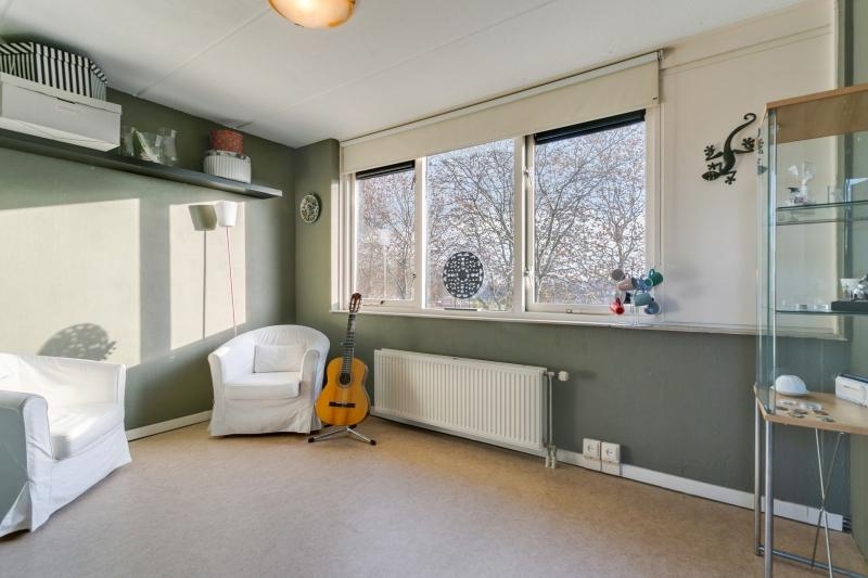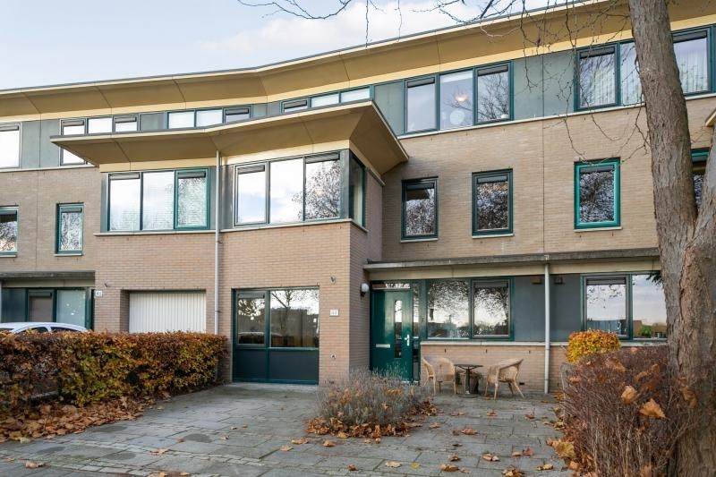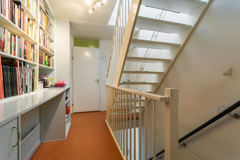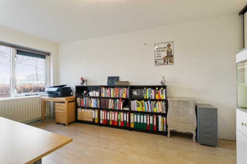 Aan de voorzijde is een kantoorruimte gerealiseerd in de voormalige garage met een diepe inbouwkast onder de trap met schuifdeuren. Er ligt een lichte laminaat vloer.