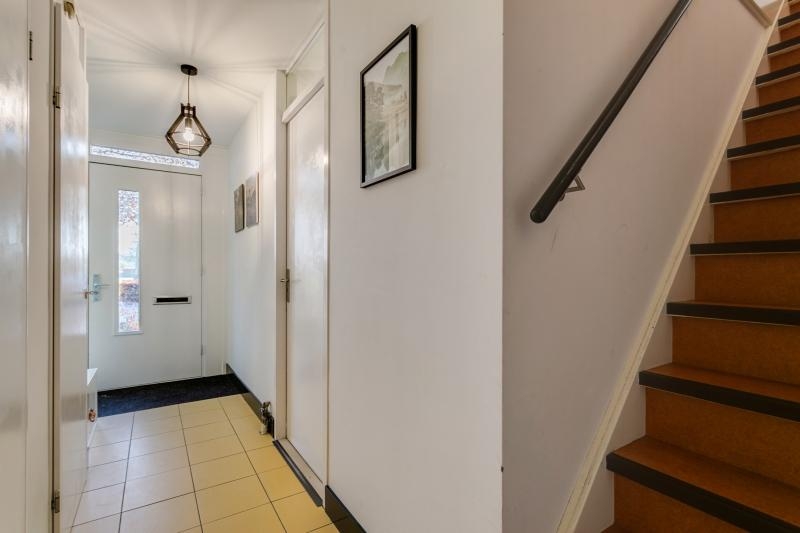 De entree van de woning is aan de voorzijde naast de kantoorruimte in de voormalige garage. Vanuit de hal met trapopgang, garderobekast, meterkast en toilet met fonteintje zijn de kantoorruimte, woonkamer en keuken bereikbaar.