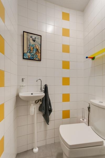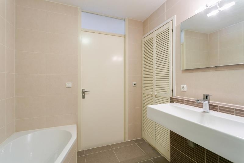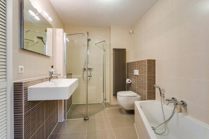De moderne badkamer is volledig betegeld en voorzien van een ligbad en inloopdouche met thermostaatkraan, een brede wastafel, inbouwkast, designradiator en 2e (hangend) toilet.