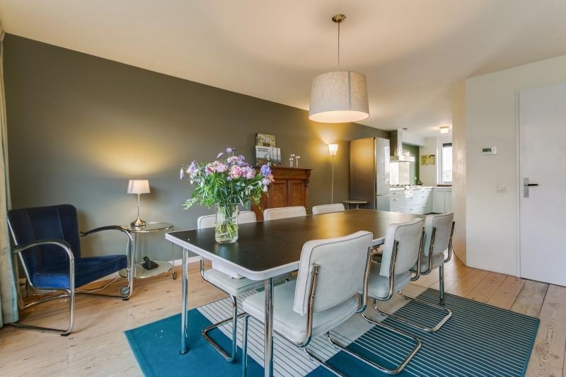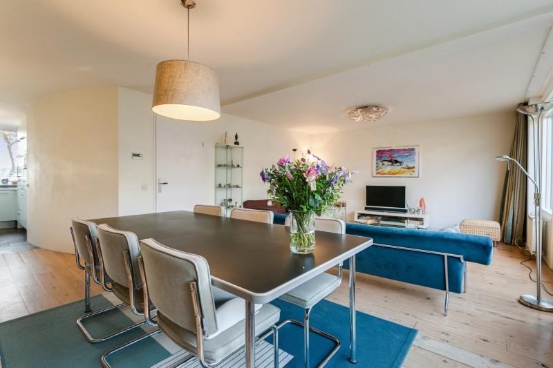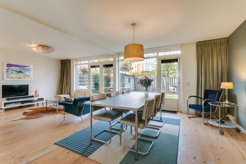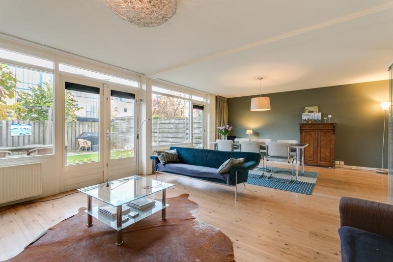 De royale, lichte woonkamer met houten vloer heeft aan de achterzijde diverse ramen en openslaande deuren naar de tuin met achterom. Aan de achtergevel hangt een elektrisch bedienbaar zonnescherm.