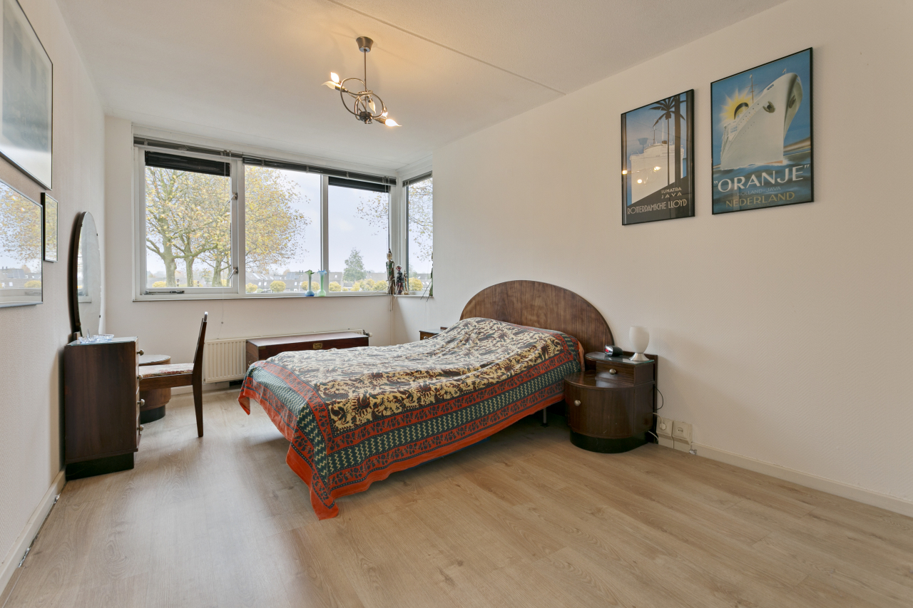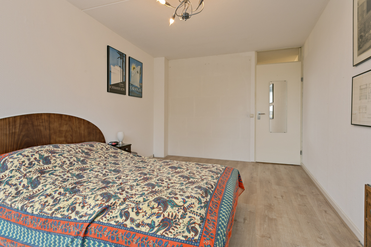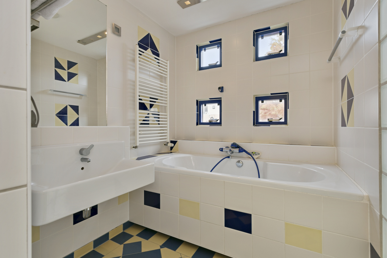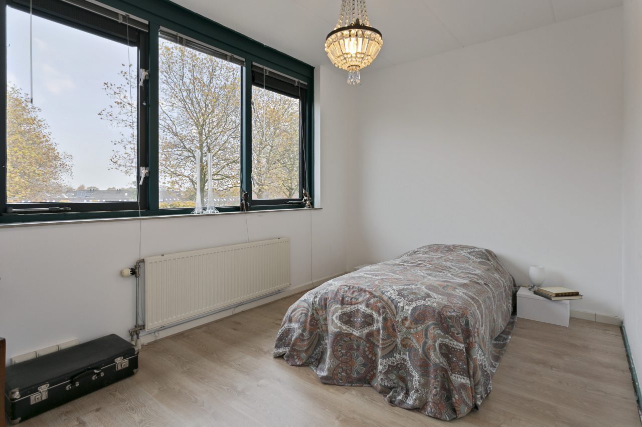 Aan de achterzijde ligt een royale slaapkamer tevens met grote ramen en met een deur naar het balkon. Via het balkon is de verwarmde berging te bereiken. De grote, complete badkamer is volledig betegeld en voorzien van een ligbad en inloopdouche met regendouche, dubbele wastafel, designradiator (2x) en 2e toilet.