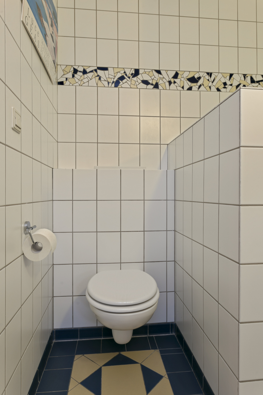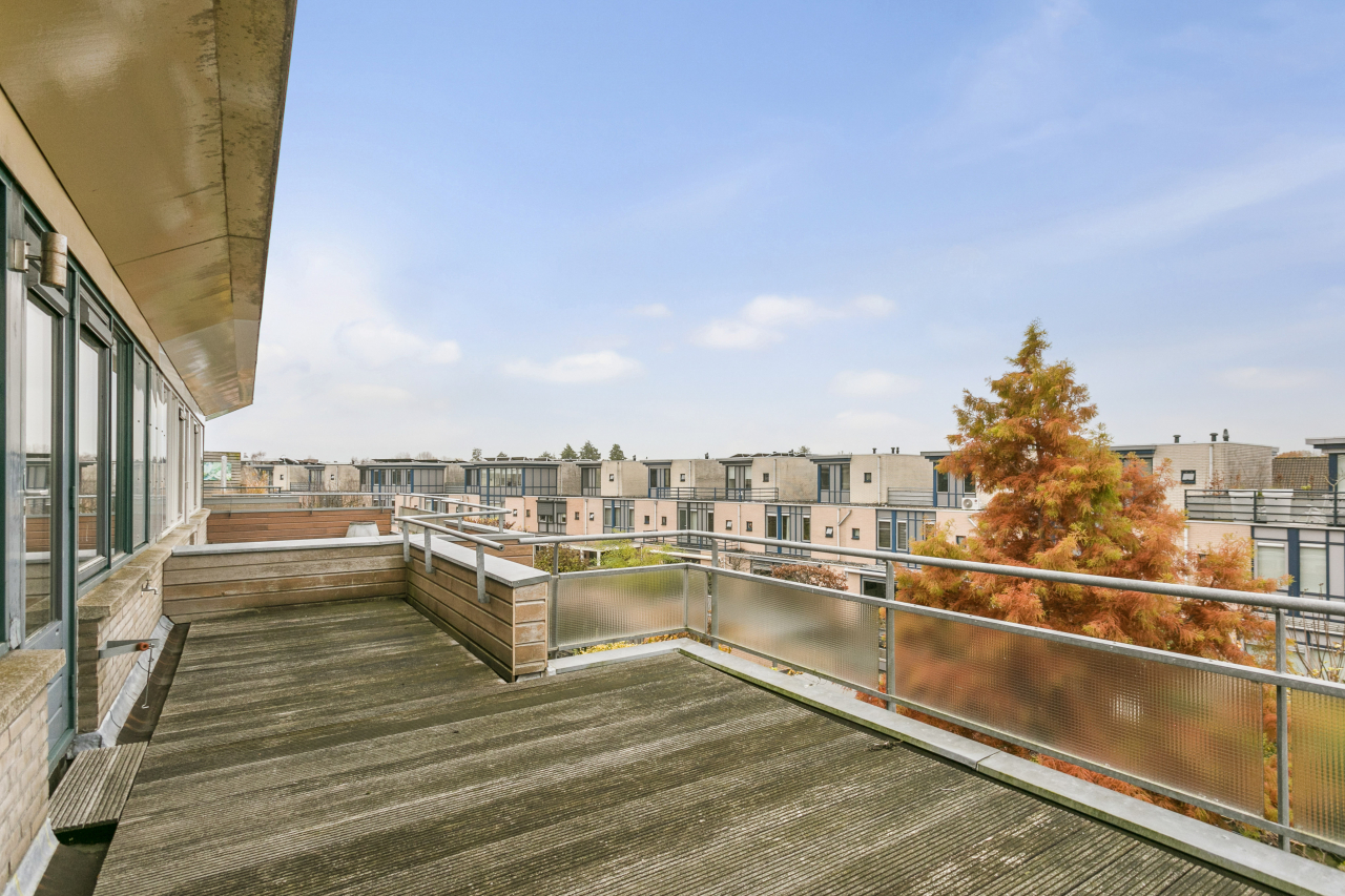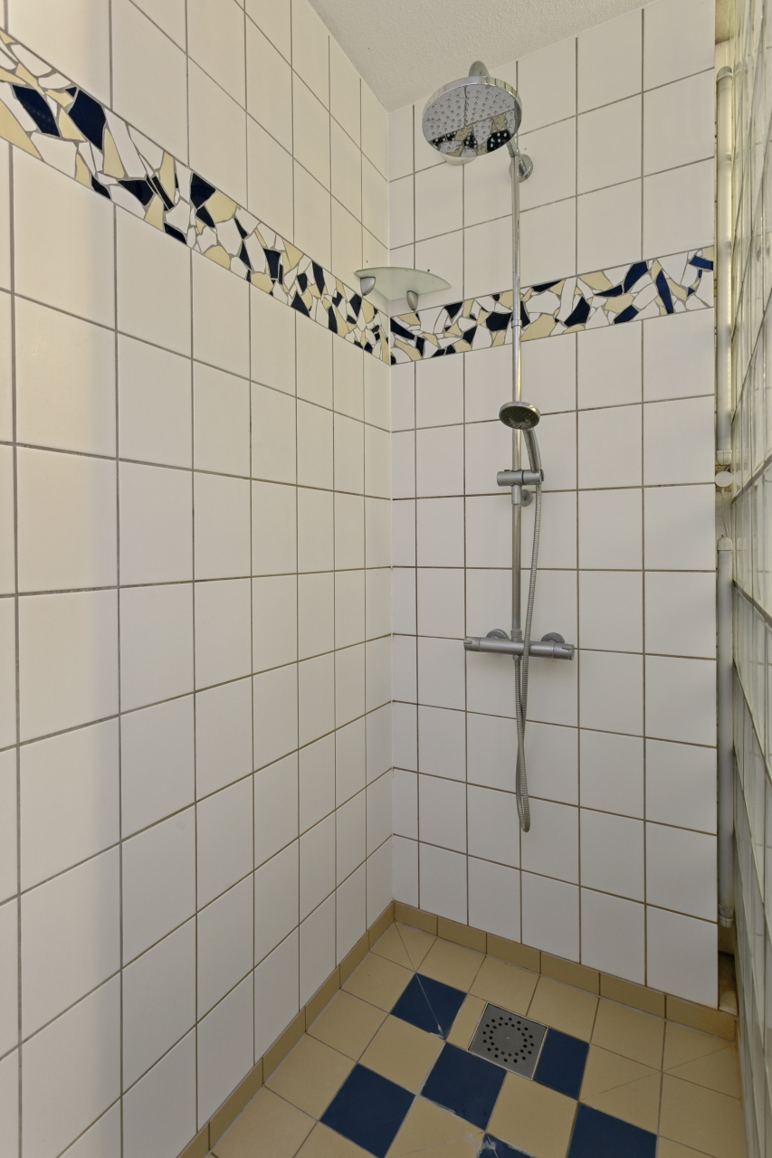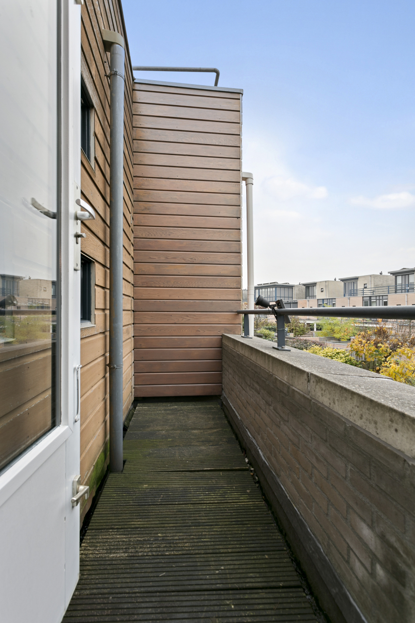 Aan de achterzijde ligt een royale slaapkamer tevens met grote ramen en met een deur naar het balkon. Via het balkon is de verwarmde berging te bereiken. De grote, complete badkamer is volledig betegeld en voorzien van een ligbad en inloopdouche met regendouche, dubbele wastafel, designradiator (2x) en 2e toilet.