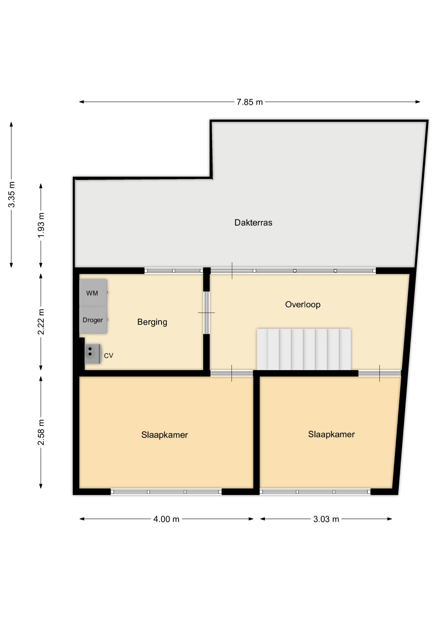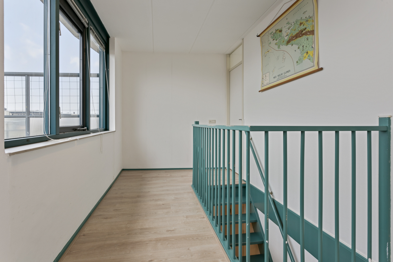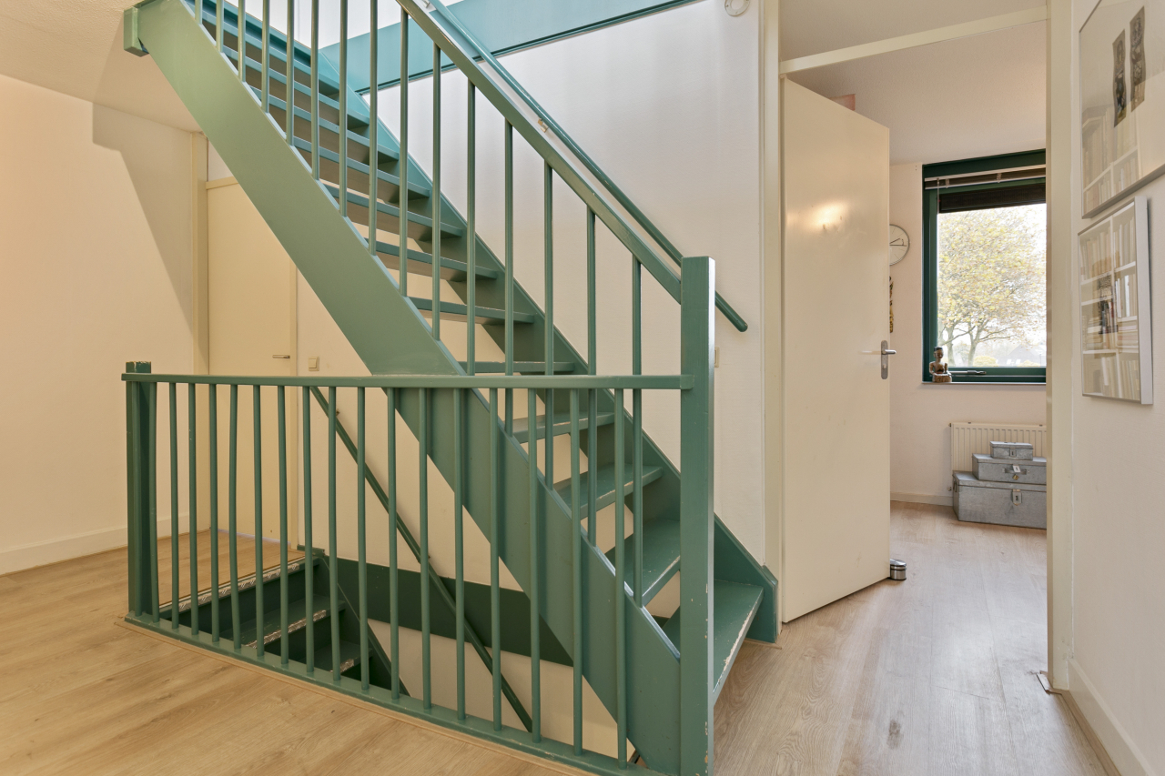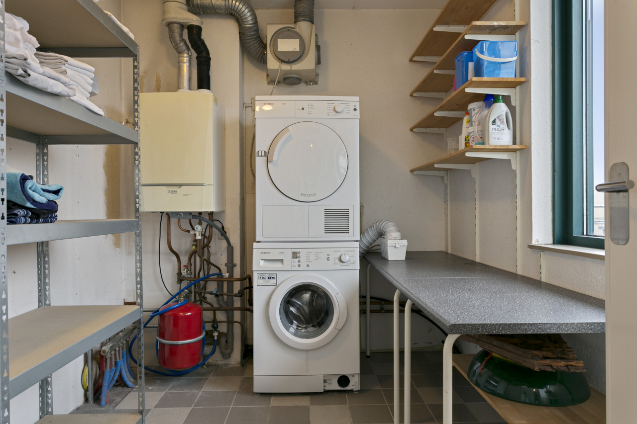 De 2e verdieping is ook bereikbaar met een vaste trap en hier bevinden zich aan de overloop 2 slaapkamers en de praktische witgoedruimte met de Remeha CV HR (huur)ketel en mechanische ventilatie unit. Via een deur is het grote dakterras te bereiken.