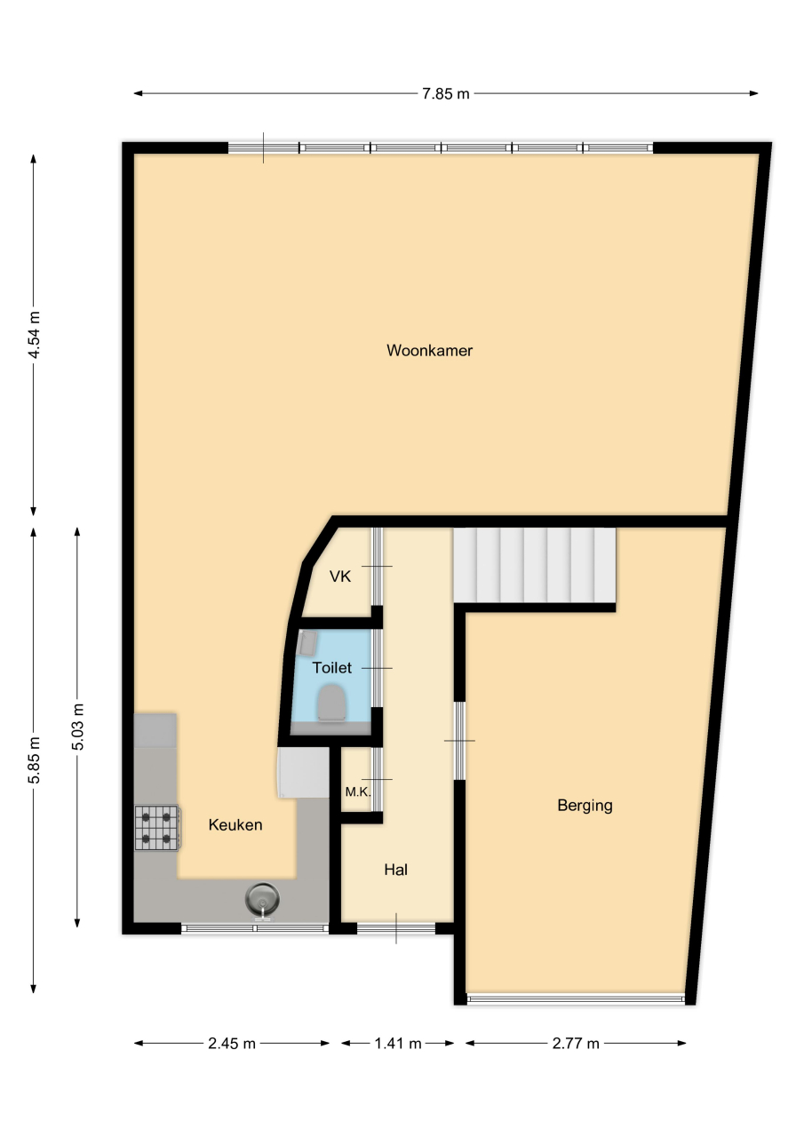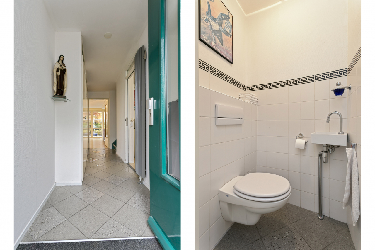 De entree van de woning is aan de voorzijde naast de garage/berging. Deze ruimte is op dit moment in gebruik als berging maar geschikt voor diverse doeleinden. Vanuit de hal met trapopgang, garderobekast, meterkast en toilet met fonteintje zijn de garage , woonkamer en keuken bereikbaar.