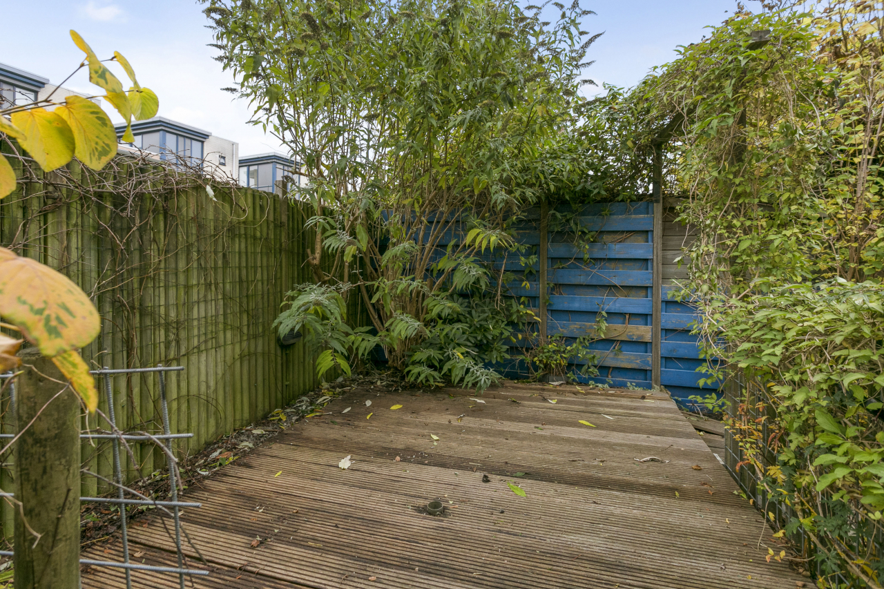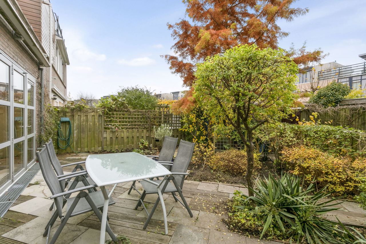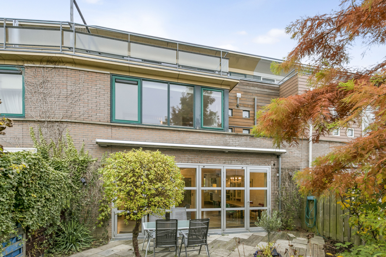 Achter de woning ligt de zonnige tuin op het Zuidwesten met sierbestrating (diagonaal gelegd), vlonders, borders met planten en struiken/bomen. Er is een groot terras bij de grote schuifpui. Achterin de tuin staat een houten berging met achterom. De woning ligt vlakbij scholen, winkels, park, speeltuin en kinderboerderij.