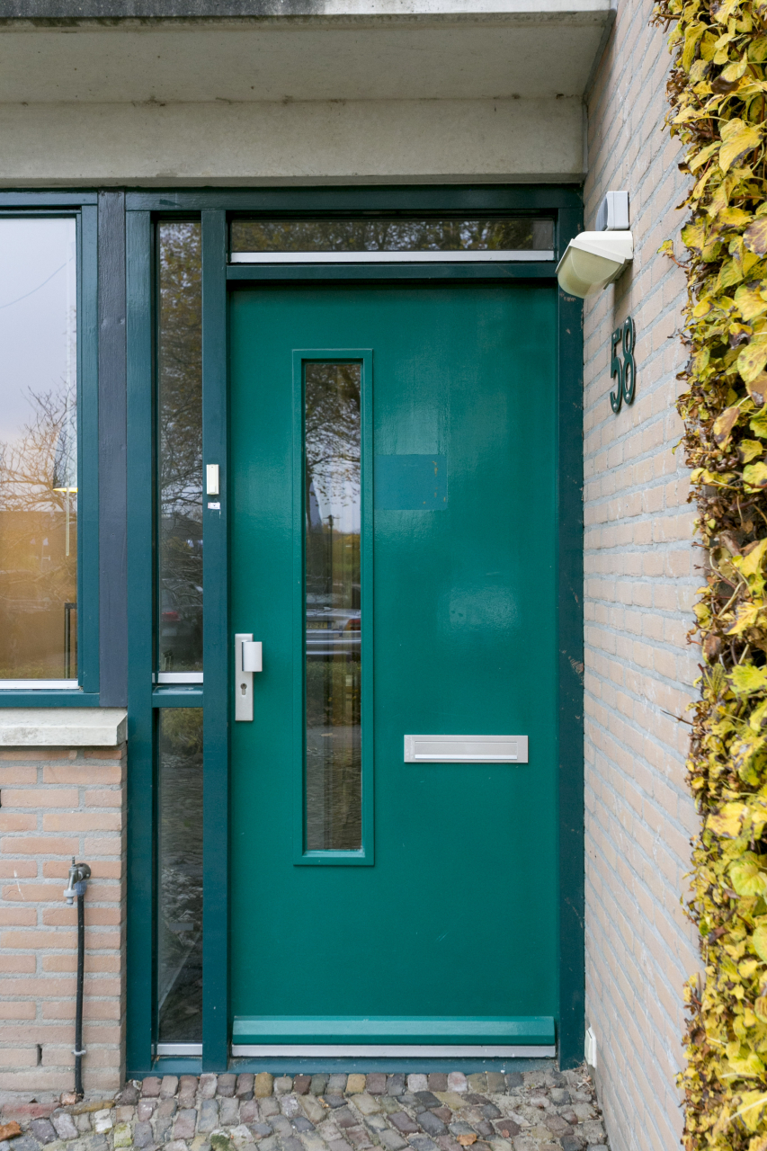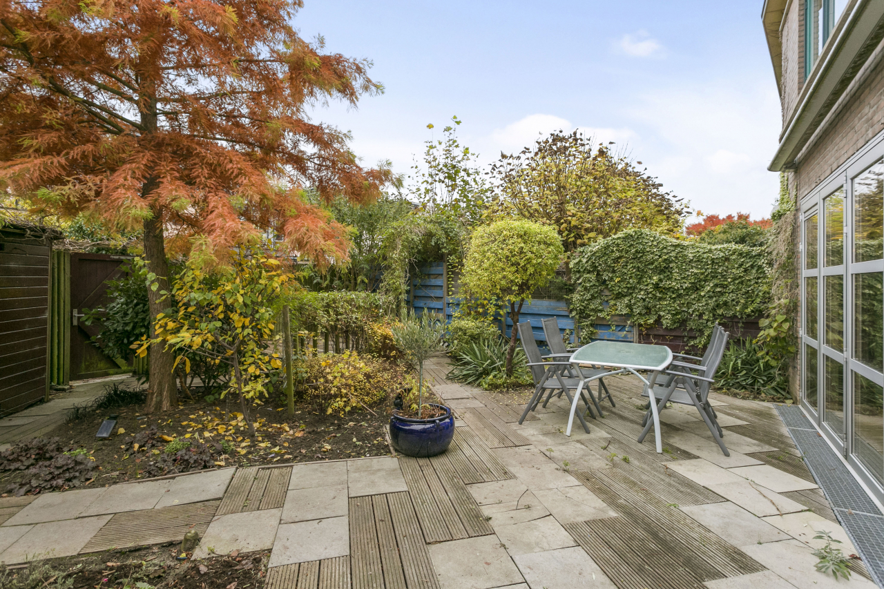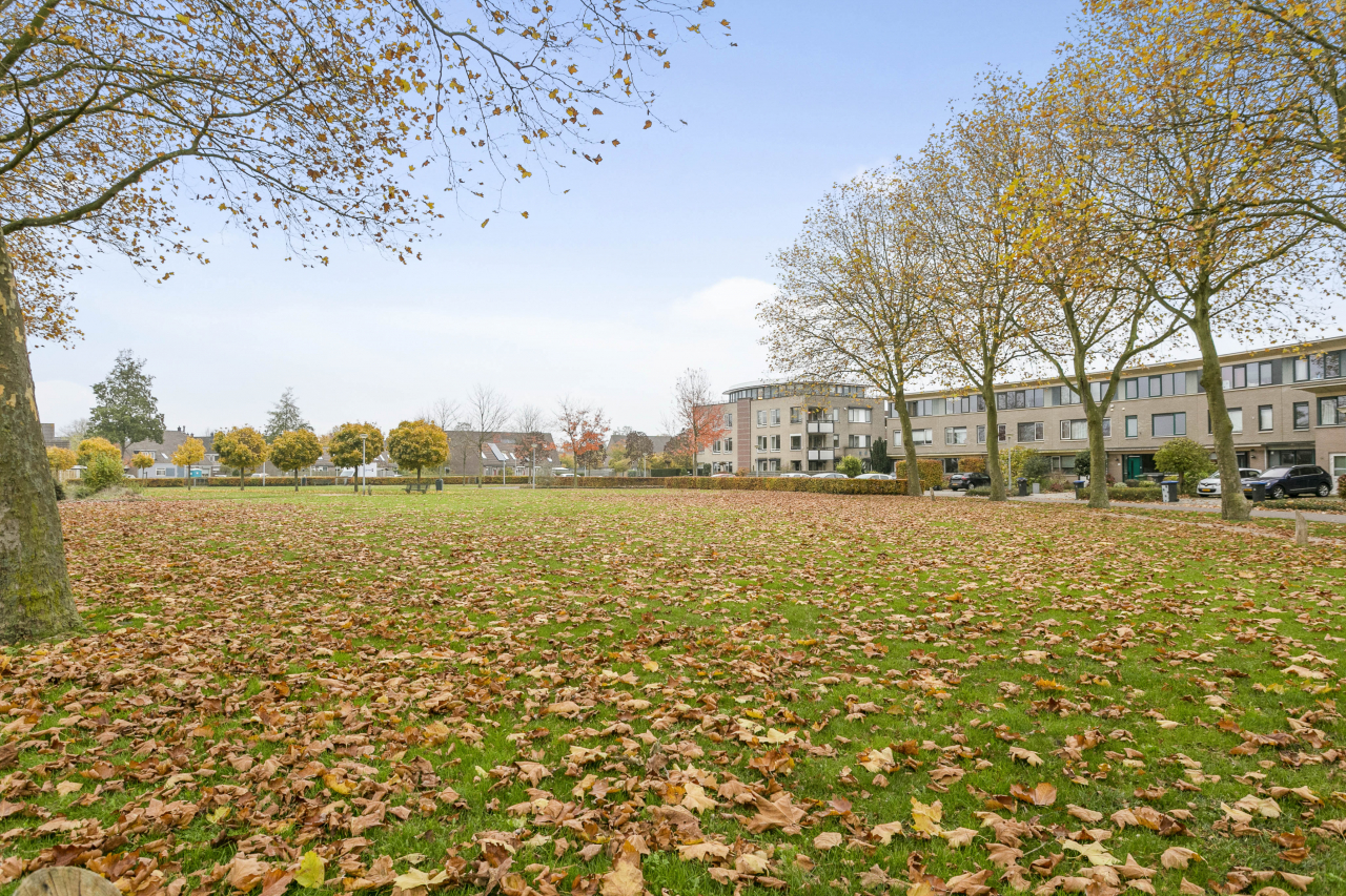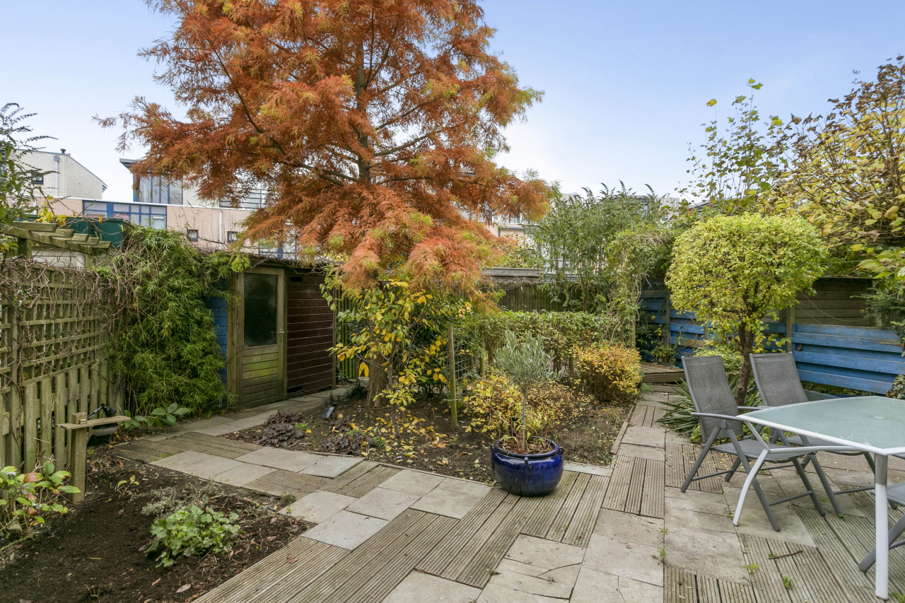 Achter de woning ligt de zonnige tuin op het Zuidwesten met sierbestrating (diagonaal gelegd), vlonders, borders met planten en struiken/bomen. Er is een groot terras bij de grote schuifpui. Achterin de tuin staat een houten berging met achterom. De woning ligt vlakbij scholen, winkels, park, speeltuin en kinderboerderij.