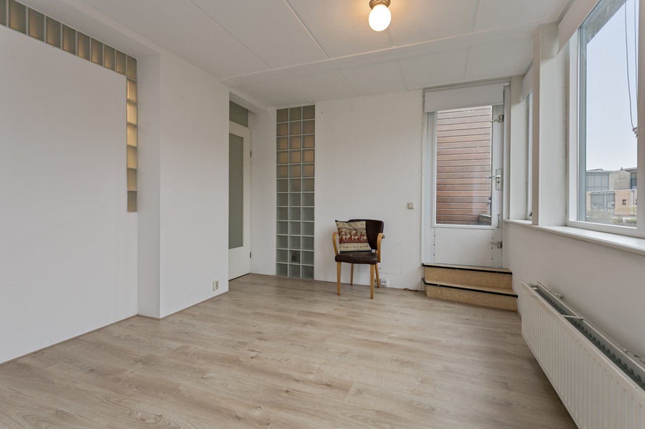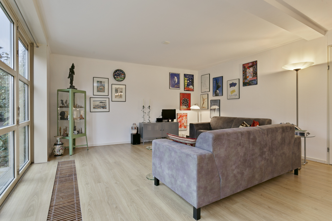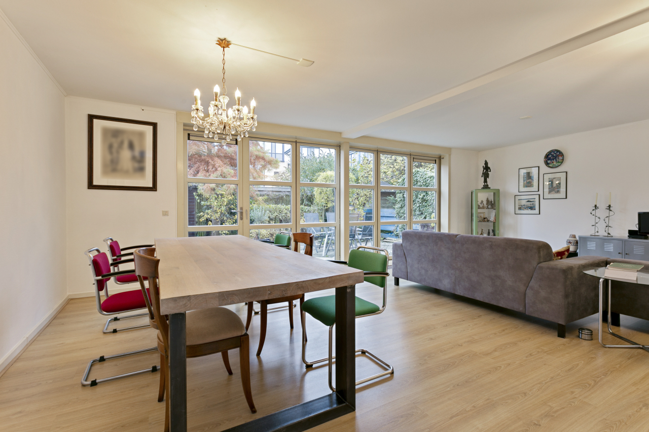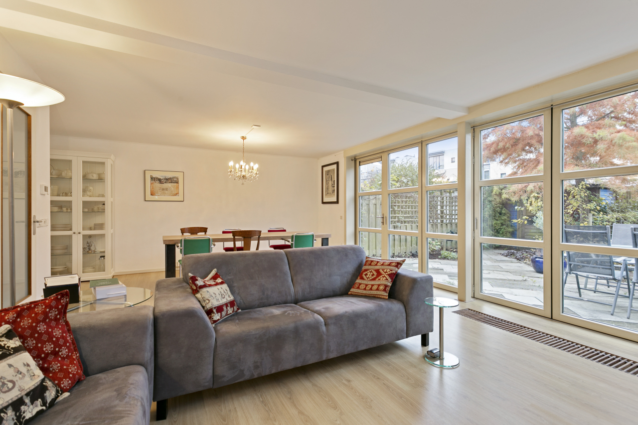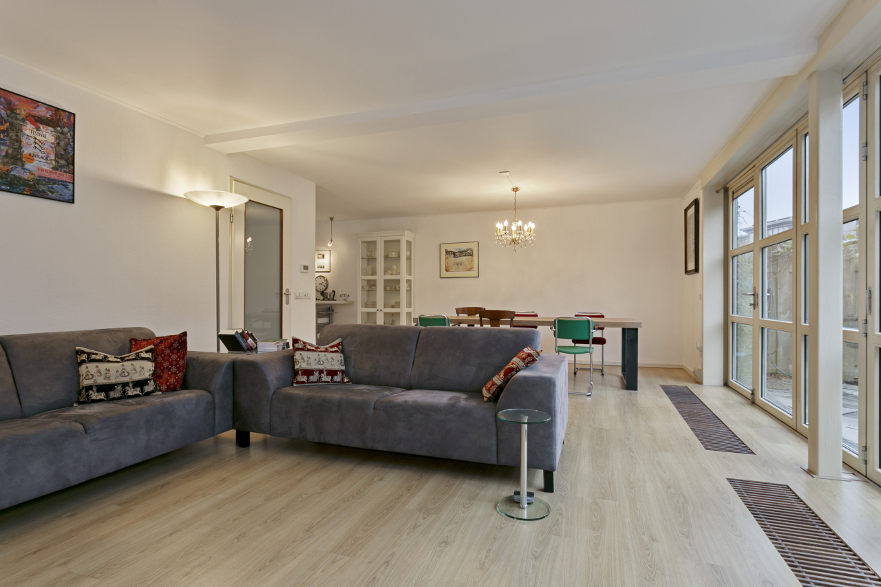 De ruime, lichte woonkamer met laminaat vloer heeft aan de achterzijde een schuifpui die volledig open kan. Hierdoor is er prachtig zicht op de tuin op het Zuidwesten met achterom.