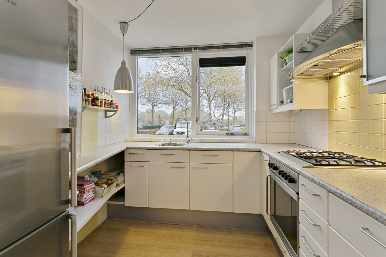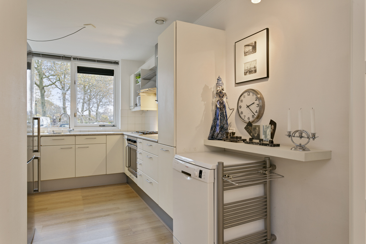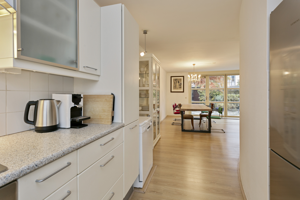 Bij de keuken bevindt zich de eethoek. De open keuken in U vorm is ingericht met diverse inbouwapparatuur zoals: een ATAG 4-pits gastoestel en – afzuigschouw. Oven en losse vaatwasser en Miele koelvriescombinatie. Vanuit de keuken is fraai uitzicht over het park.