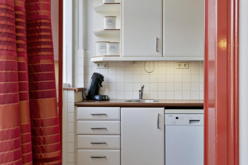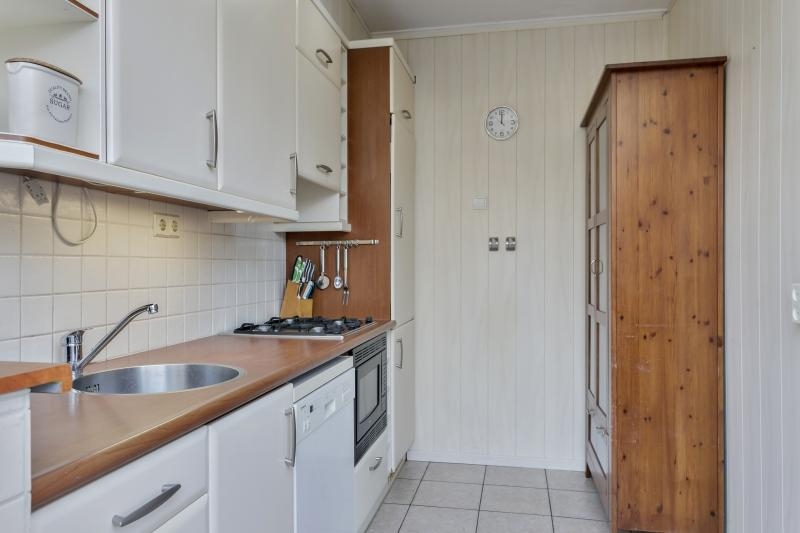 De halfopen keuken met aanrechtblad met spoelbak is voorzien van diverse keukenkastjes en inbouwapparatuur zoals een 4 pits gaskookplaat en afzuigkap, combi oven/magnetron, koelvriescombinatie en vaatwasser.
