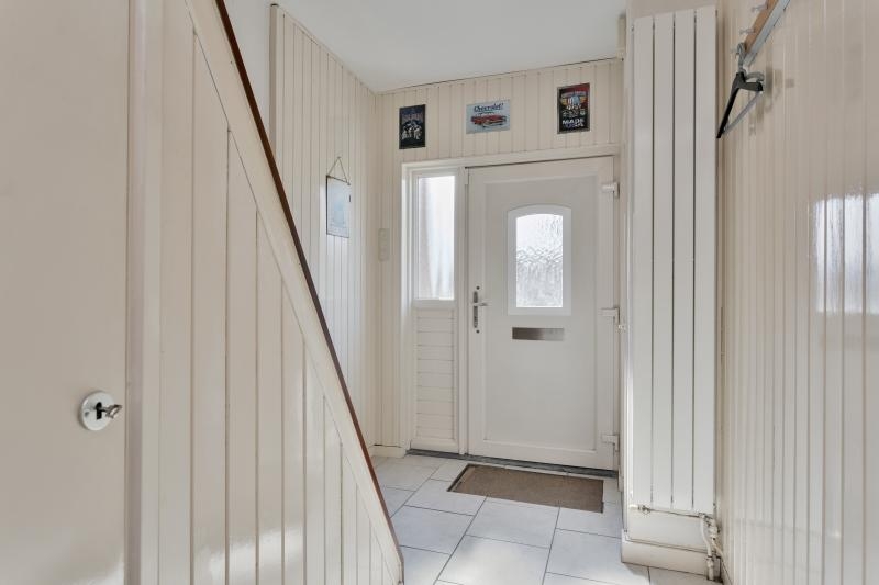 Via de ruime hal met lichte tegelvloer, garderobe, meterkast bergkast en toilet bereikt u de woonkamer.