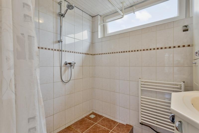 De volledig betegelde badkamer is voorzien van een brede, open douche, designradiator en wastafelmeubel. Aan de overloop is een extra bergkast.