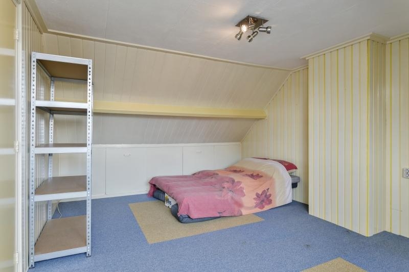 De royale 4e slaapkamer, ook met vloerbedekking(vloertegels), heeft een dakkapel aan de achterzijde en diverse bergkasten achter de knieschotten.