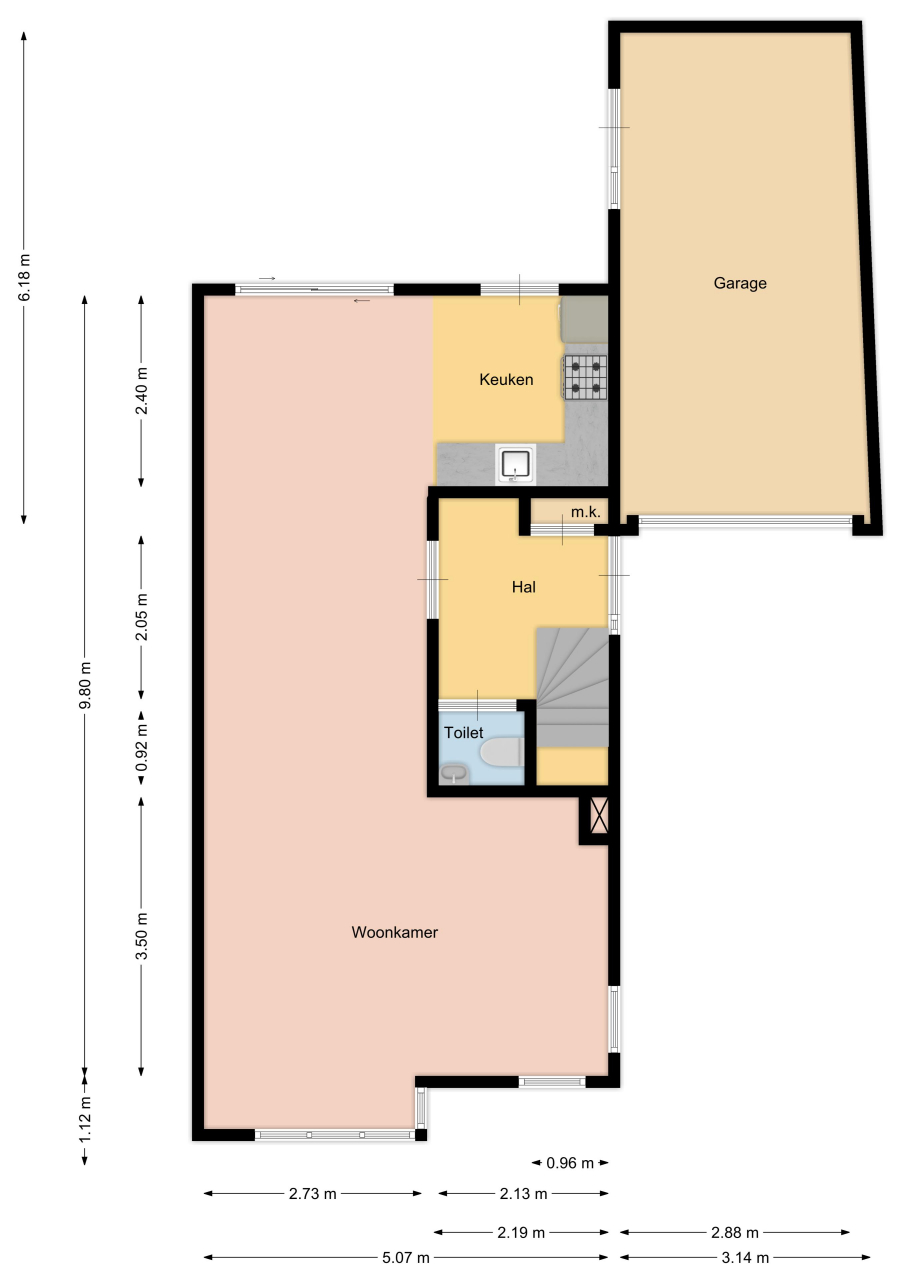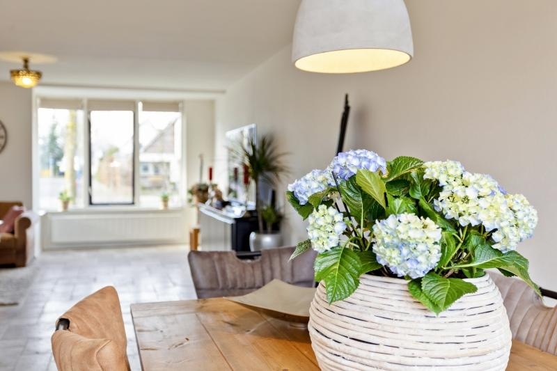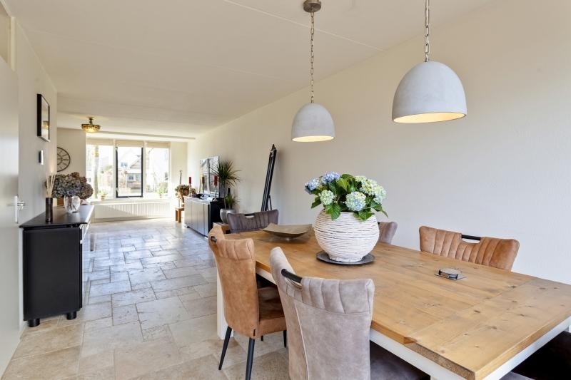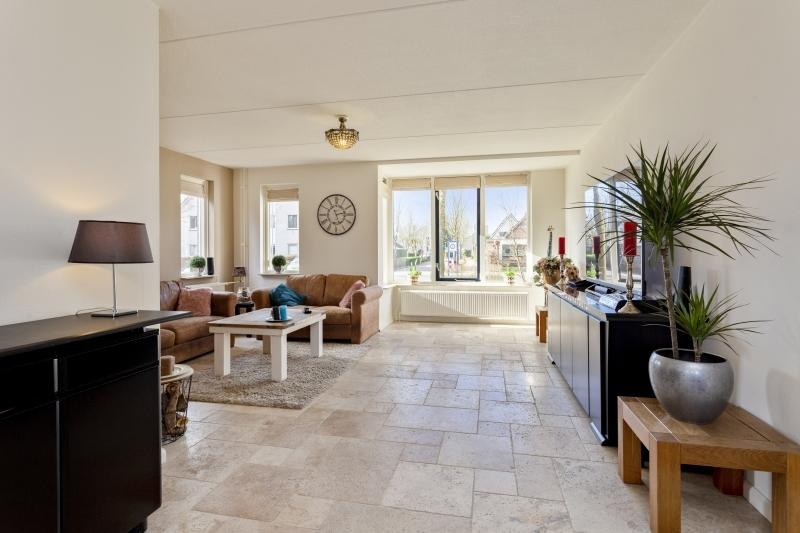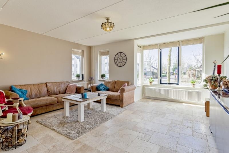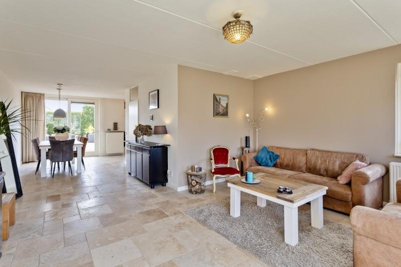 Via de hal met lichte Travertin tegelvloer, garderobe, meterkast, modern toilet met fonteintje bereikt u de woonkamer. De L-vormige, ruime woonkamer is voorzien van een lichte Travertin tegelvloer. Aan de voorzijde is een fraaie erker en bij de zithoek is een rookkanaal aanwezig met de mogelijkheid voor het plaatsen van een sfeervolle houtkachel of openhaard.