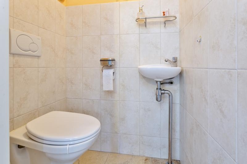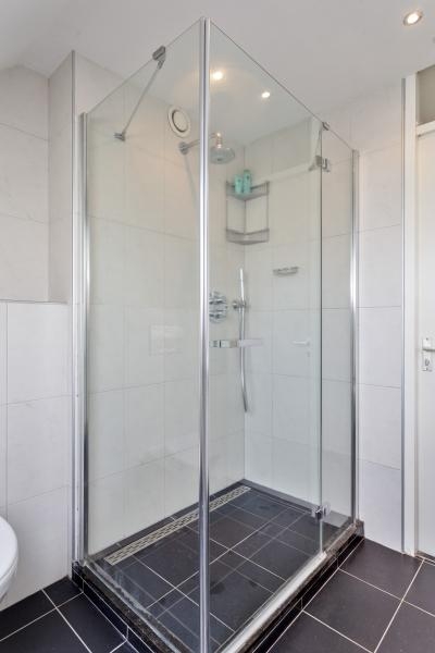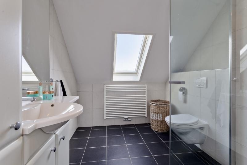 Aan de achterzijde ligt de moderne badkamer Deze volledig betegelde badkamer is voorzien van een inloopdouche met thermostaatkraan, een wastafelmeubel, designradiator en 2e (hangend) toilet.