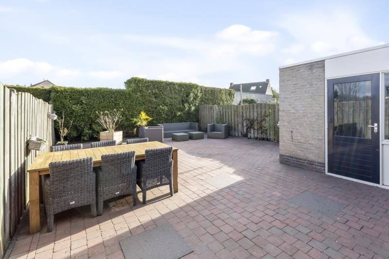 Achter de woning ligt een onderhoudsvriendelijke tuin. Met sierbestrating en aan de zijkanten omsloten door houten schuttingen met enkele beplanting. Aan de achterzijde een groene (coniferen) haag. Door de ligging op het Zuidoosten is er altijd wel een zonnig plekje te vinden. De garage is ook via een loopdeur bereikbaar.