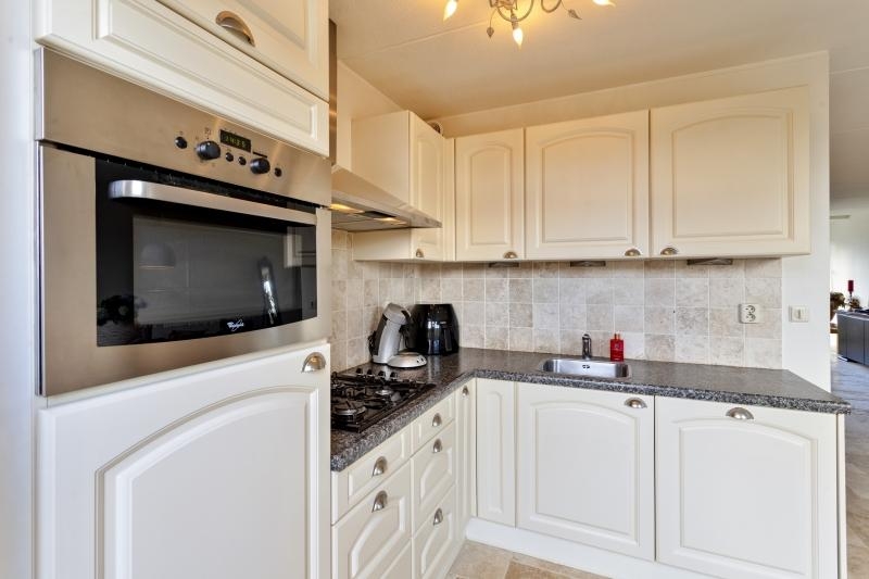 Aan de achterzijde is de eethoek met schuifpui, bij de open keuken. Deze keuken met L-vormig aanrechtblad is voorzien van diverse inbouwapparatuur zoals een Whirlpool 4-pits gas kookplaat met afzuigschouw, Whirlpool combimagnetron, Whirlpool vaatwasser en Etna koelkast.