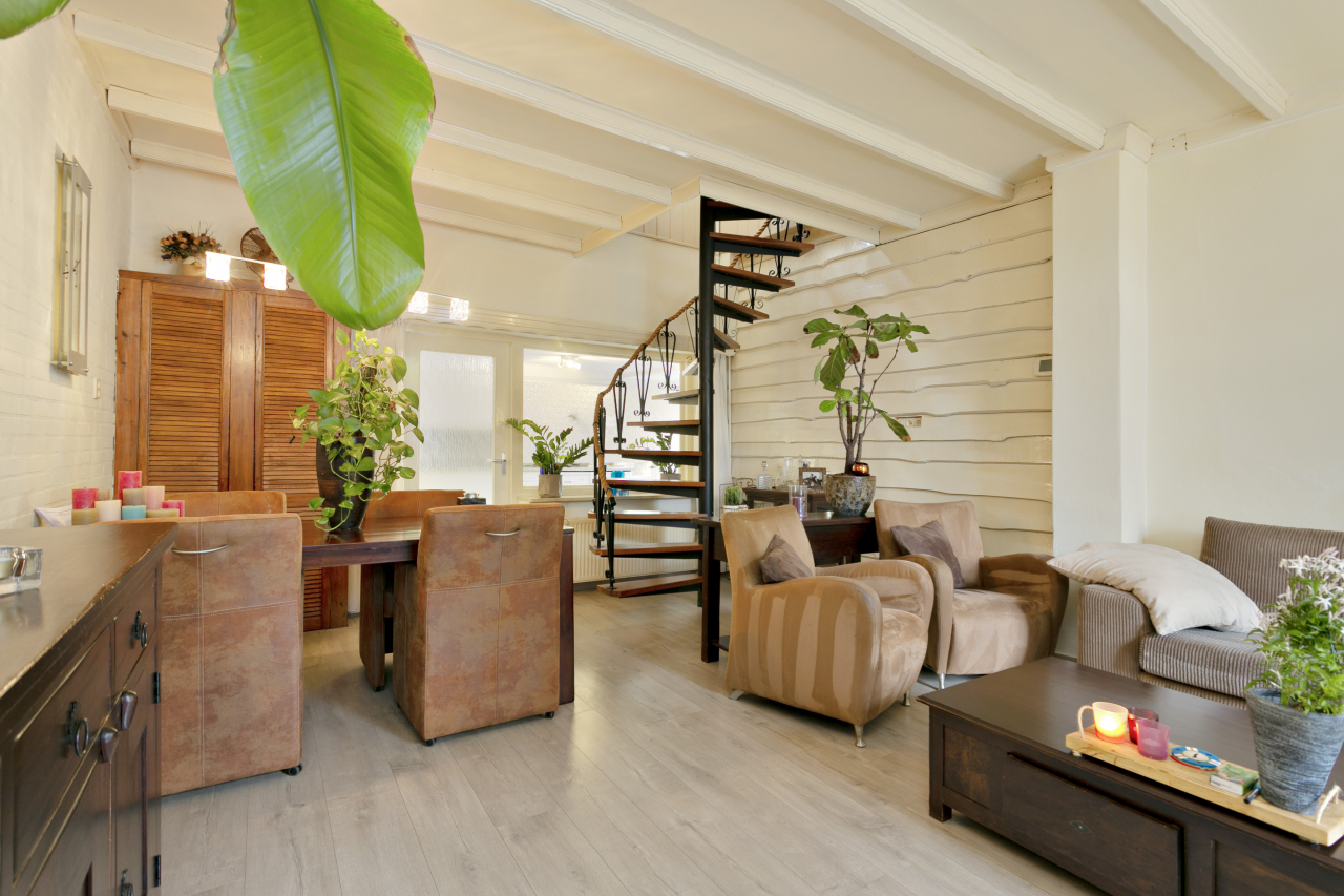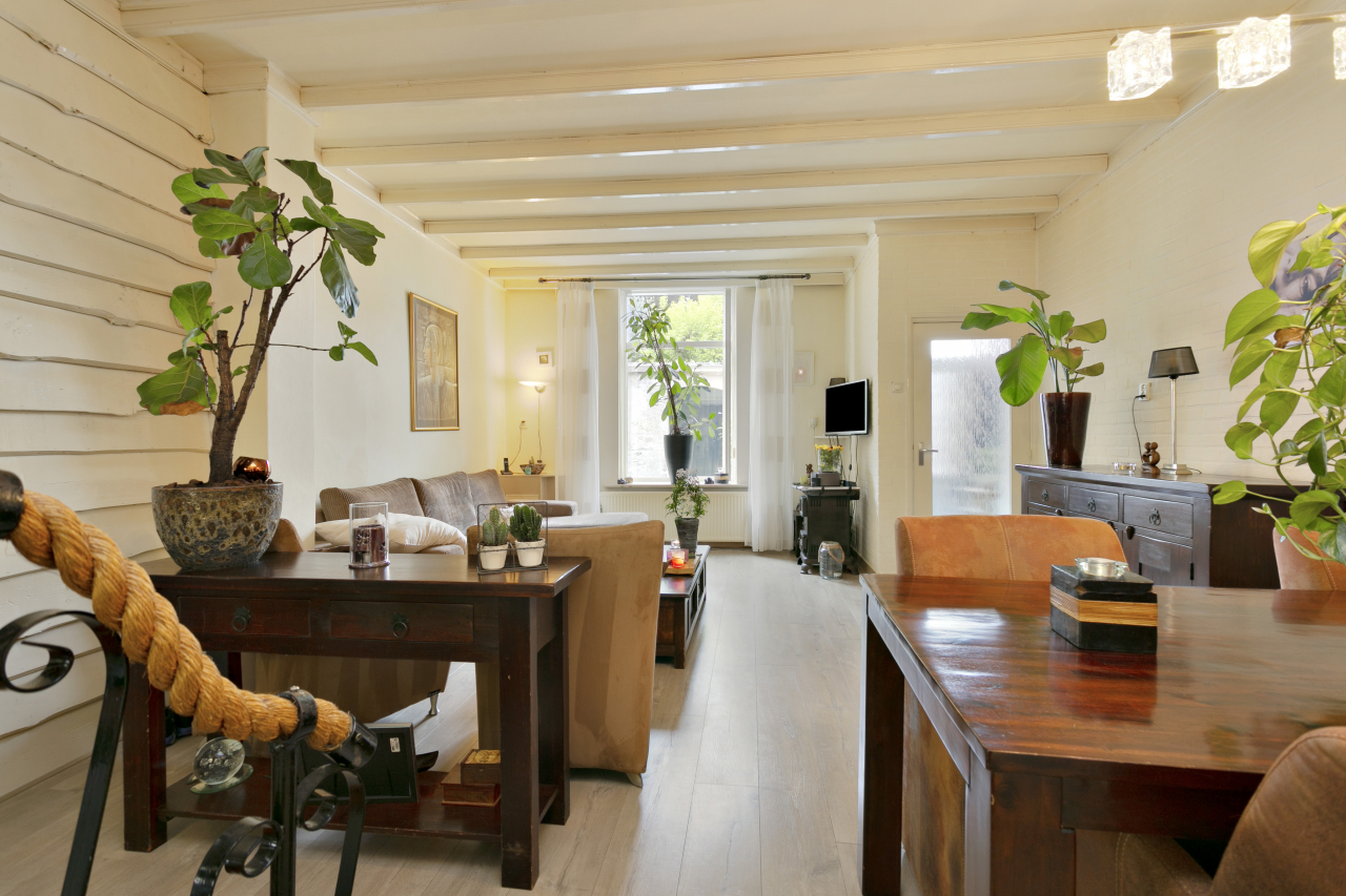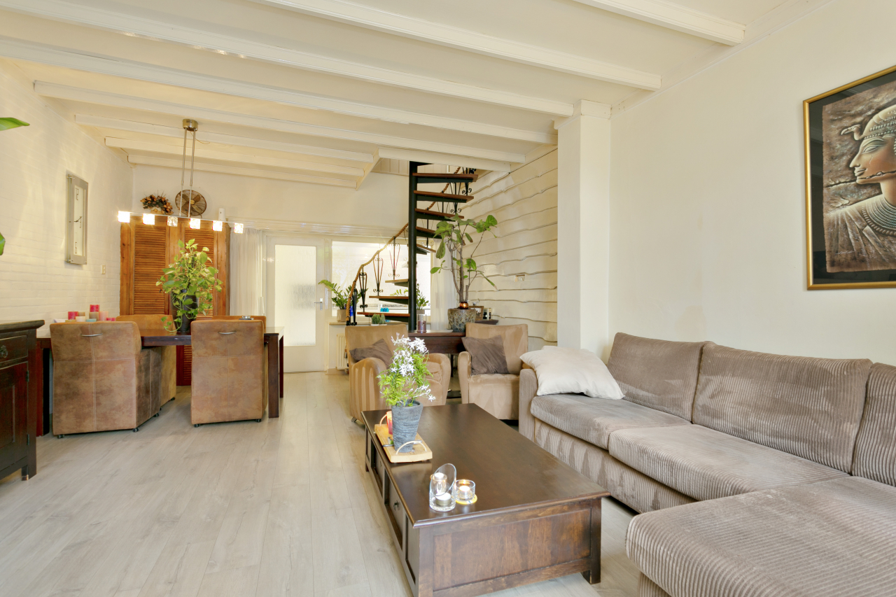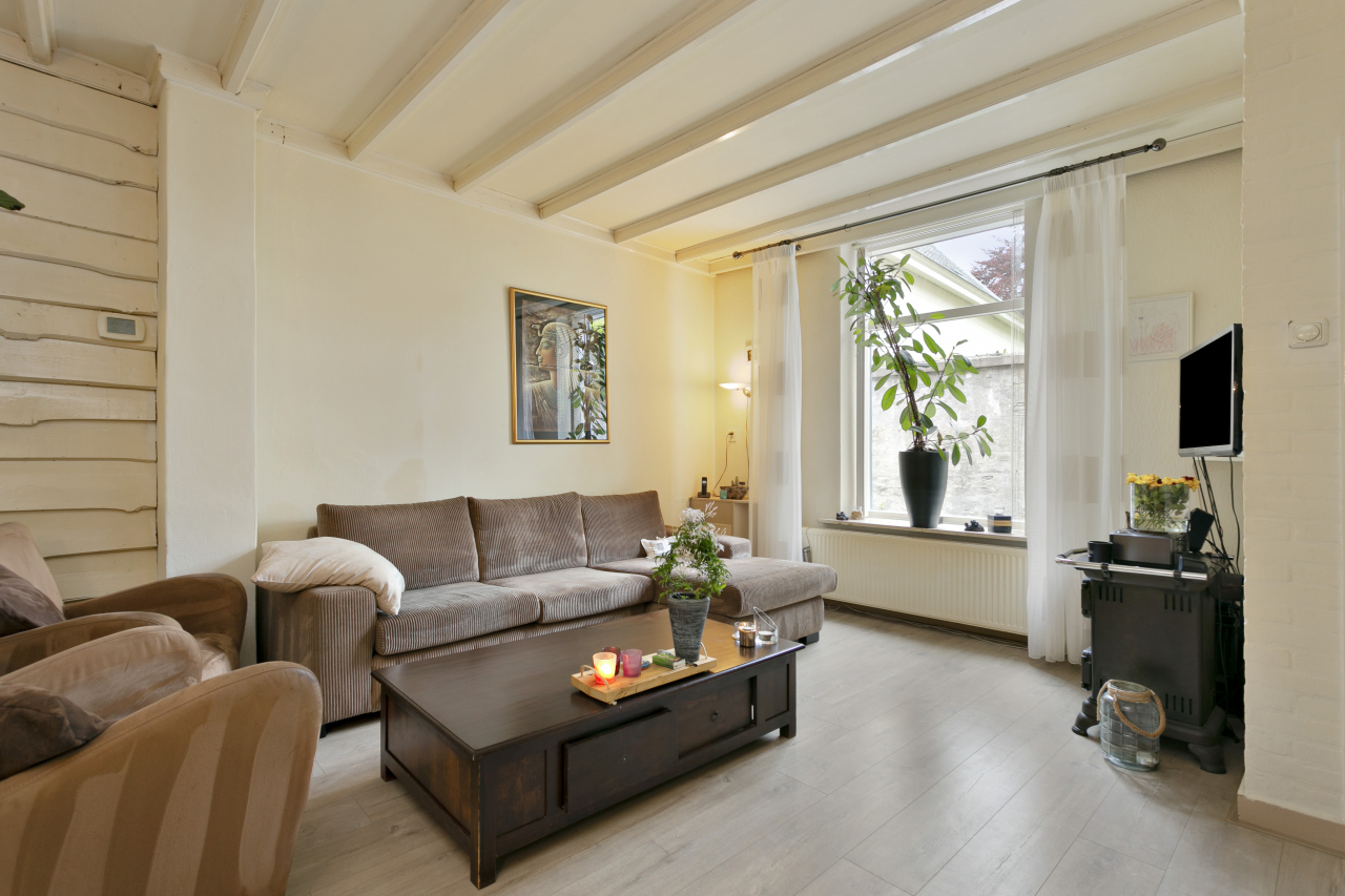 Via de deur met raam in de hal is de L-vormige woonkamer bereikbaar. Deze is ook voorzien van een laminaatvloer en heeft een zithoek en groot raam aan de voorzijde.Verder een fraai balkenplafond en een wenteltrap naar de eerste verdieping.