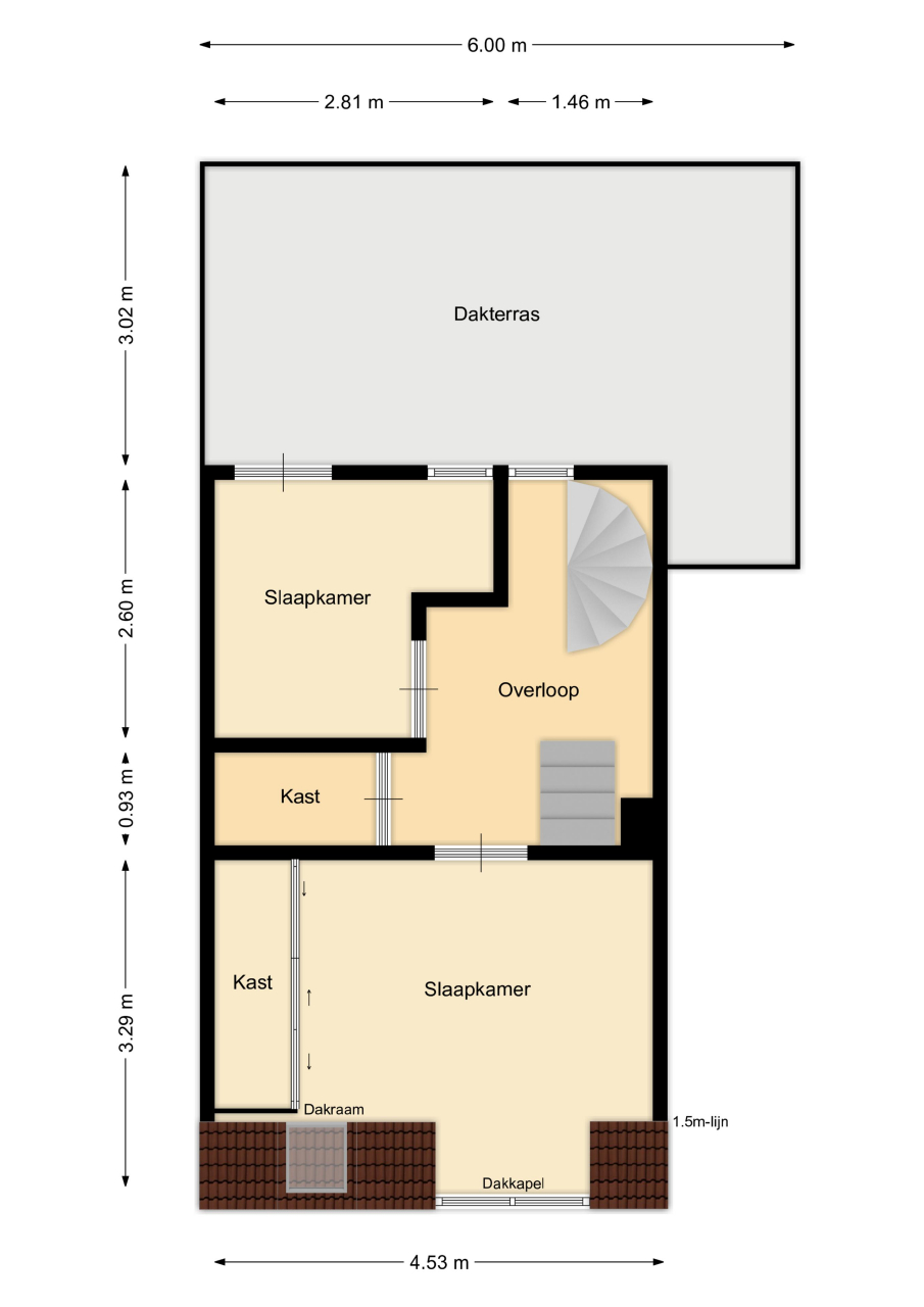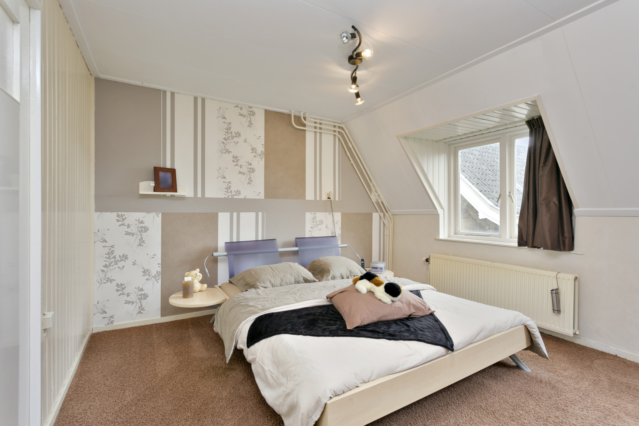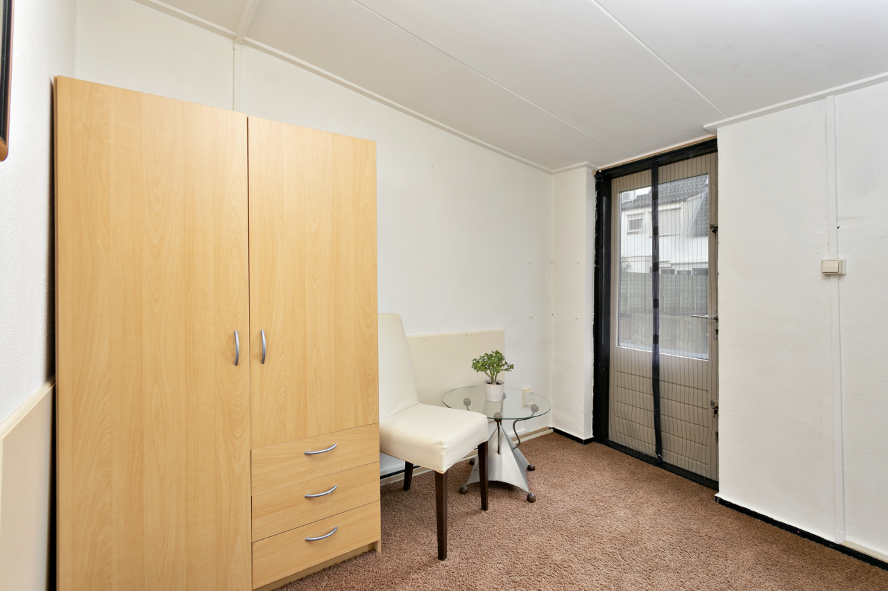 Aan de overloop ligt aan de achterzijde de 2e slaapkamer met vloerbedekking. Deze is voorzien van een raam en een deur naar het dakterras.Daarnaast is er aan de overloop nog een inbouwkast met extra bergruimte.