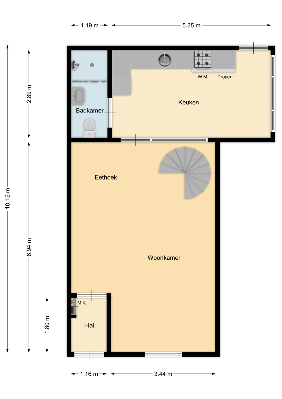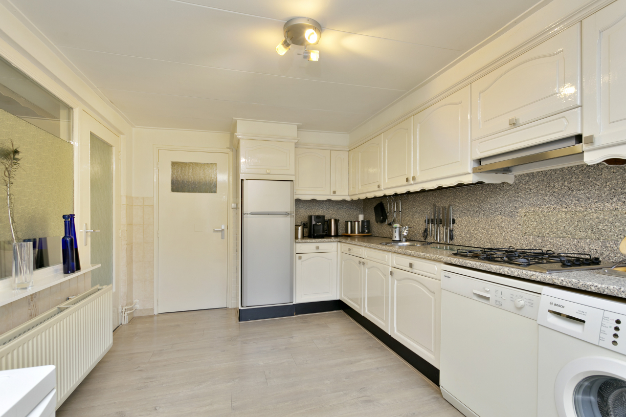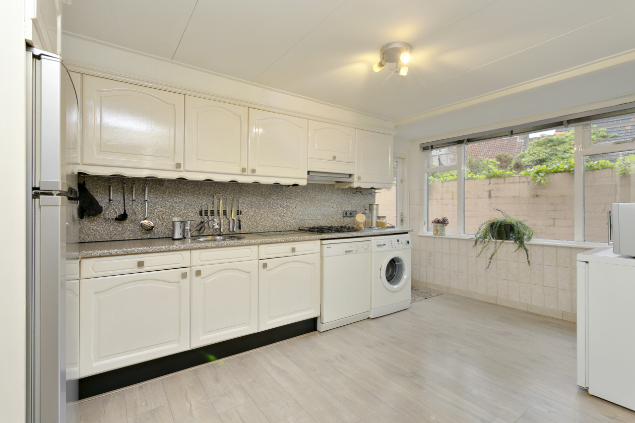 De (woon) keuken is ruim en er is voldoende ruimte voor een eettafel. De keuken in L vorm is voorzien van een aanrechtblad met keukenkasten en keukenapparatuur zoals een 4-pits gastoestel met afzuigkap, vaatwasser en koelkast. Er is ook ruimte voor een wasmachine onder het keukenblad.