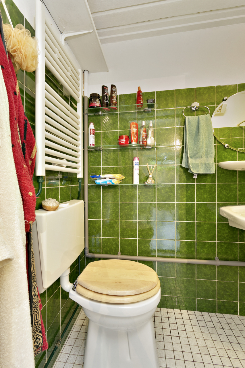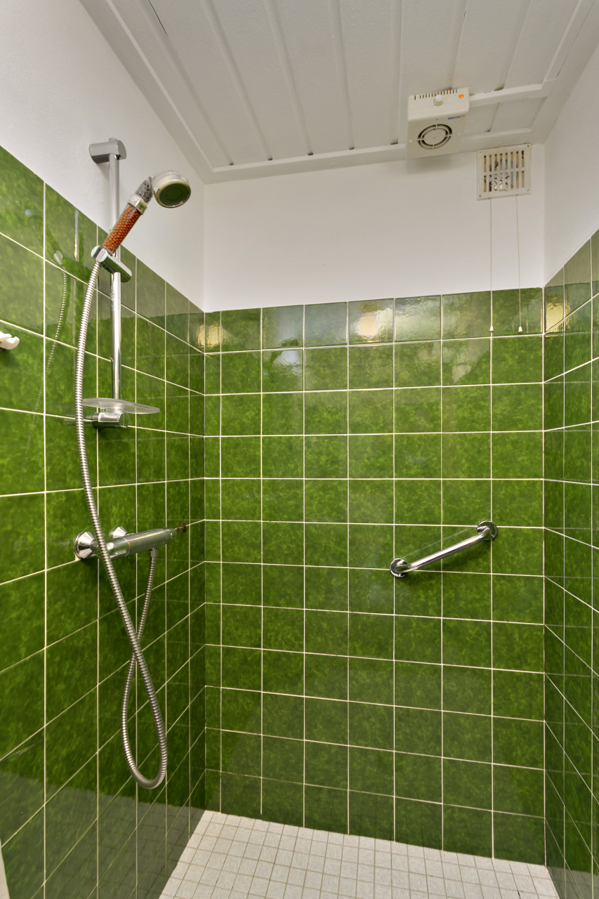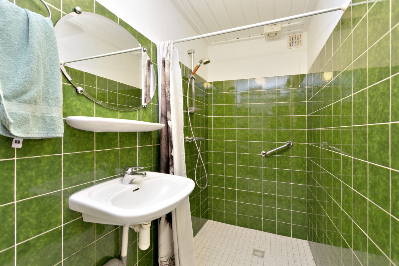 Via de deur in de keuken is de badkamer bereikbaar. Deze is eenvoudig en voorzien van een wastafel, douche en toilet.