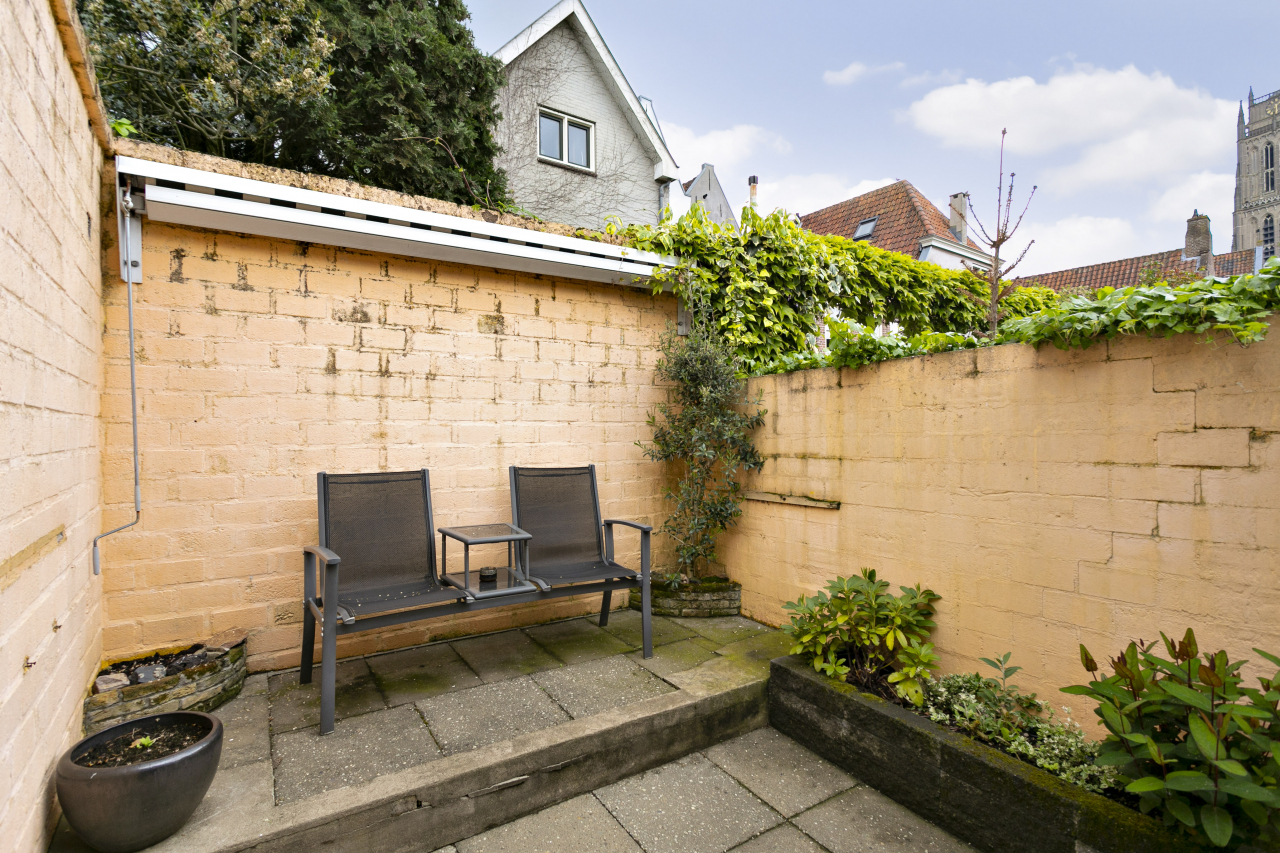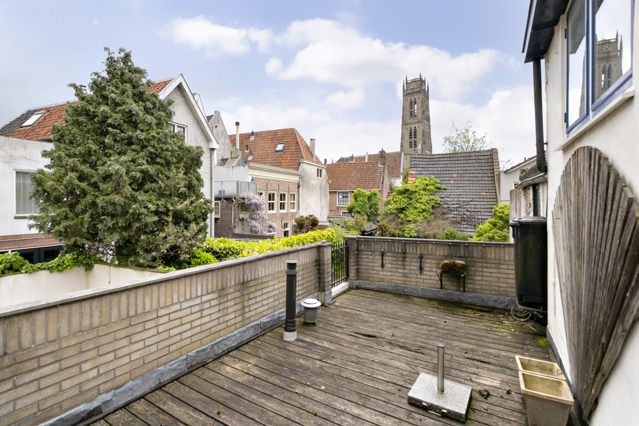 Vanuit de slaapkamer aan de achterzijde is via de deur en trapje een groot dakterras met vlonders bereikbaar. Van hieruit is er fraai zicht op de Sint Maartenstoren.