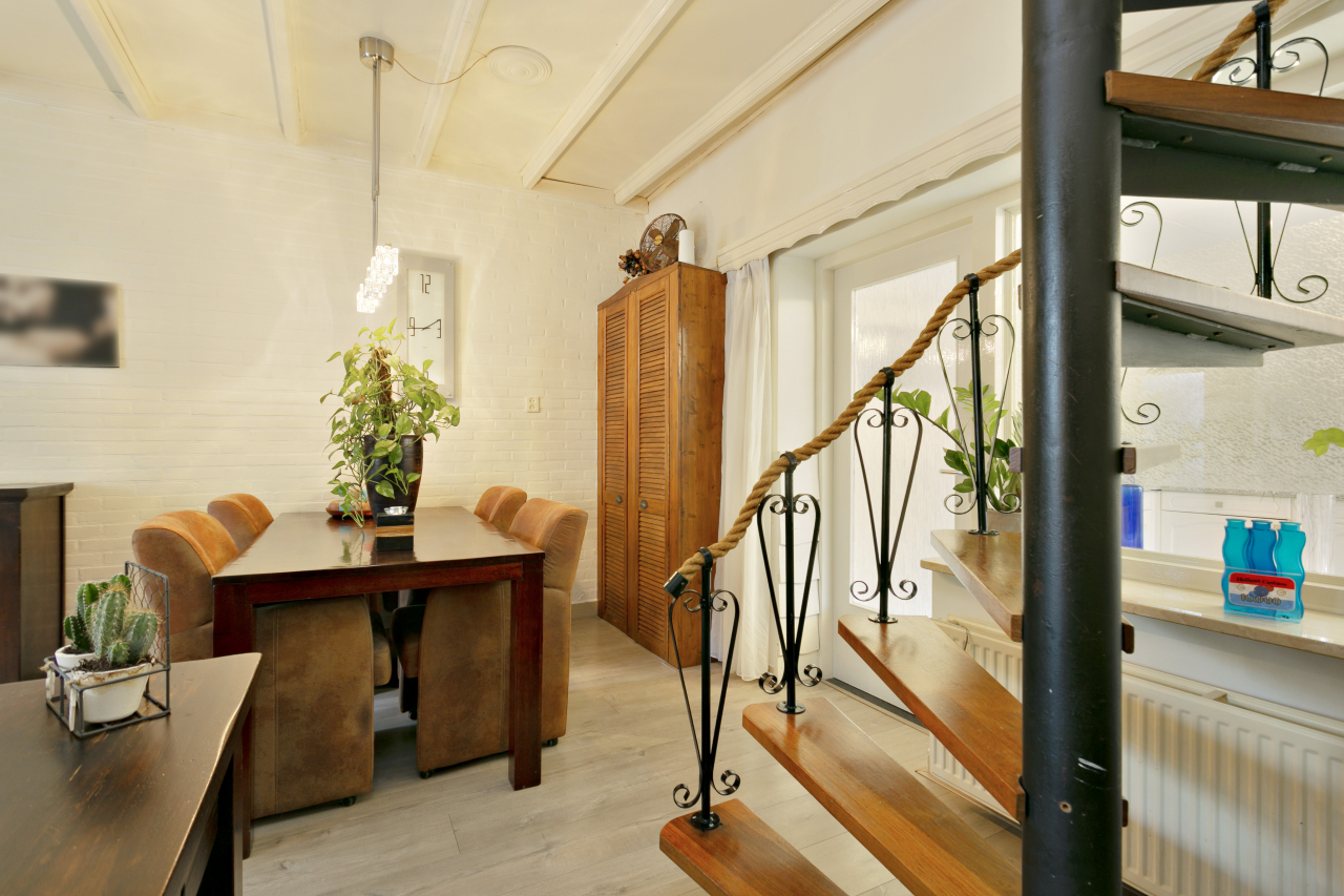 Aan de achterzijde is de eethoek (met vaste kast) bij de deur en raam naar de keuken. De woning is aan de achterzijde jaren geleden uitgebouwd.
