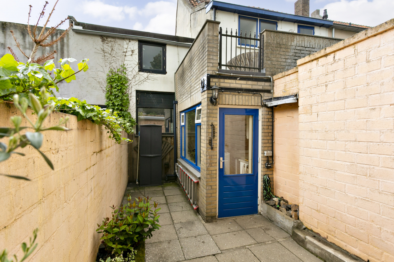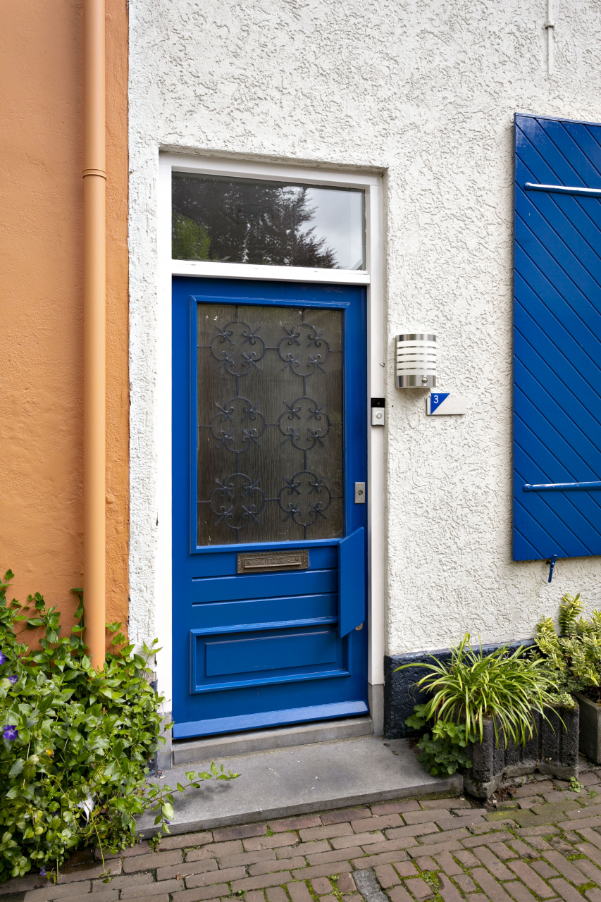 De entree van deze stadswoning is aan de voorzijde bij het raam van de woonkamer met blauwe luiken.