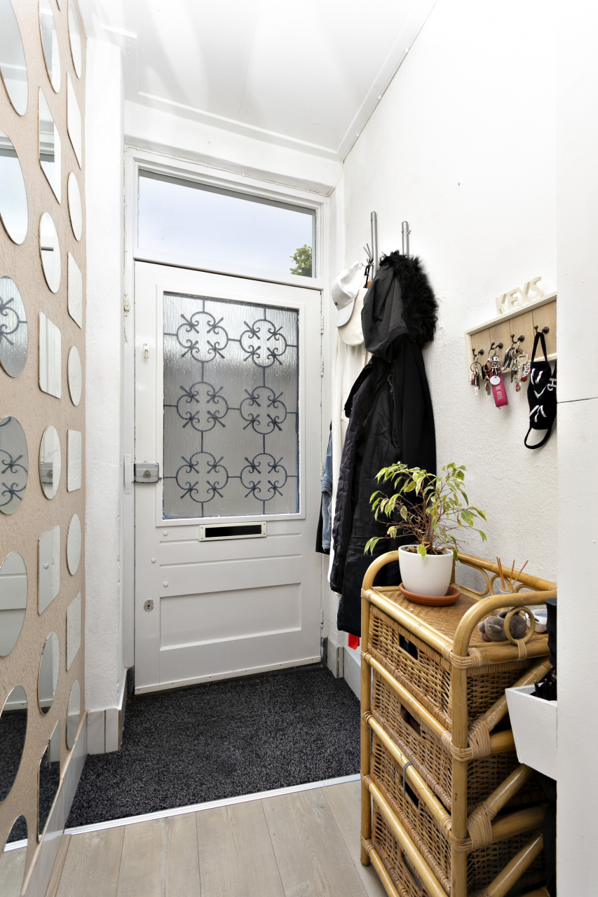 De voordeur is voorzien van een bovenlicht en raam met sierhekwerk. De voordeur geeft toegang tot een halletje voorzien van laminaat en de meterkast en garderobe.