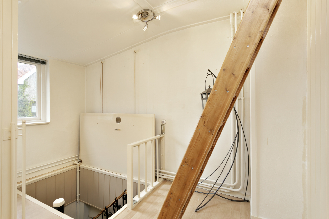 Via de trap in de woonkamer is de overloop op de 1e verdieping bereikbaar met daaraan 2 slaapkamers, een diepe inbouw kast en (losse) trap naar de zolder.