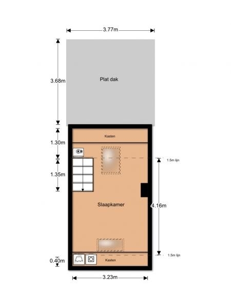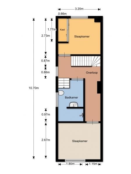 Via een vaste trap tussen de woonkamer en keuken is de overloop op de 1e verdieping bereikbaar. Ook deze is voorzien van een houten vloer. Aan de voorzijde is een slaapkamer en aan de achterzijde de 2e slaapkamer. Tussenbeiden ligt de badkamer.