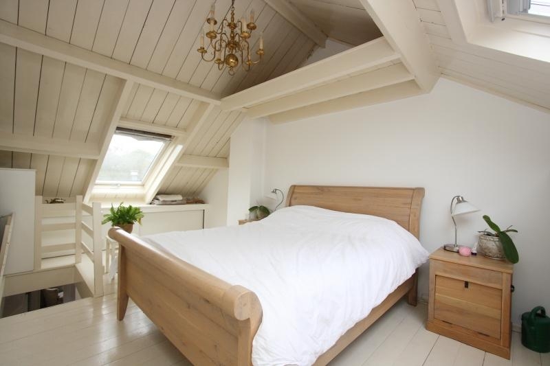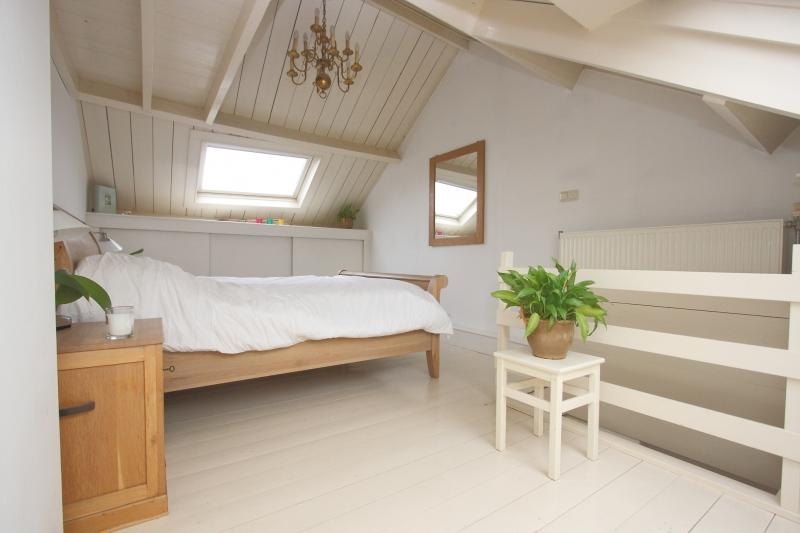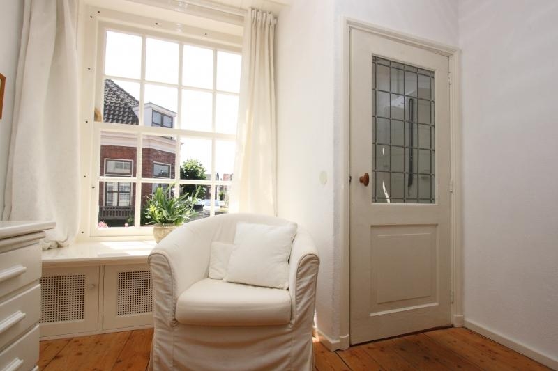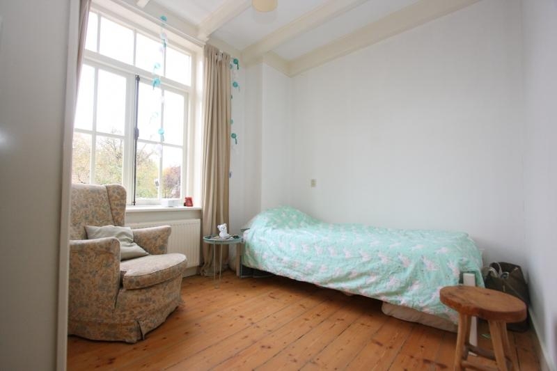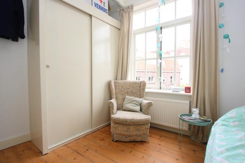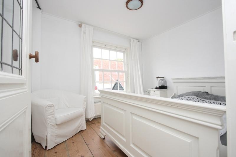 De slaapkamer aan de voorzijde is voorzien van een raam met roede verdeling en ook hier is de originele houten vloer in ere hersteld. Vanuit deze slaapkamer is er mooi zicht op de Heilige Geeststraat.