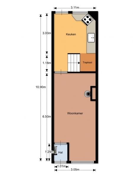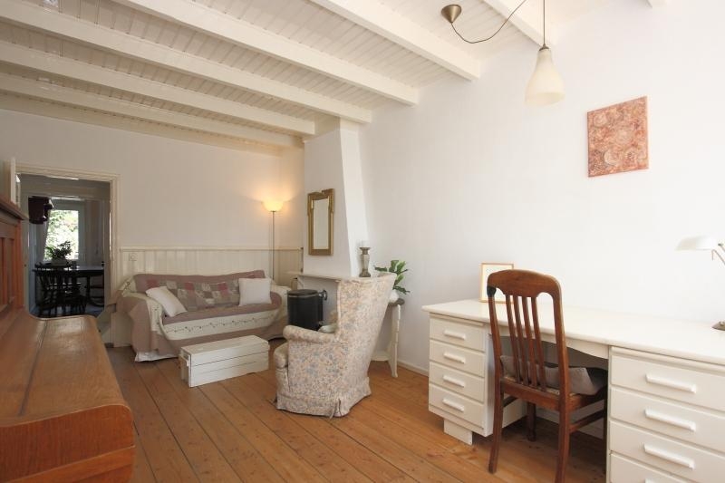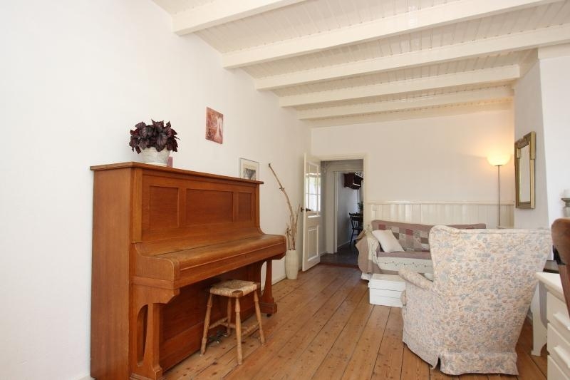 De rechthoekige woonkamer is voorzien van een balken plafond en de originele houten vloer die door de verkoper in ere is hersteld. Aan de voorzijde is een groot raam met roede verdeling en een brede vensterbank waar je op kunt zitten. Aan de achterzijde is een sfeervolle schouw met gaskachel en de deur naar de woonkeuken.