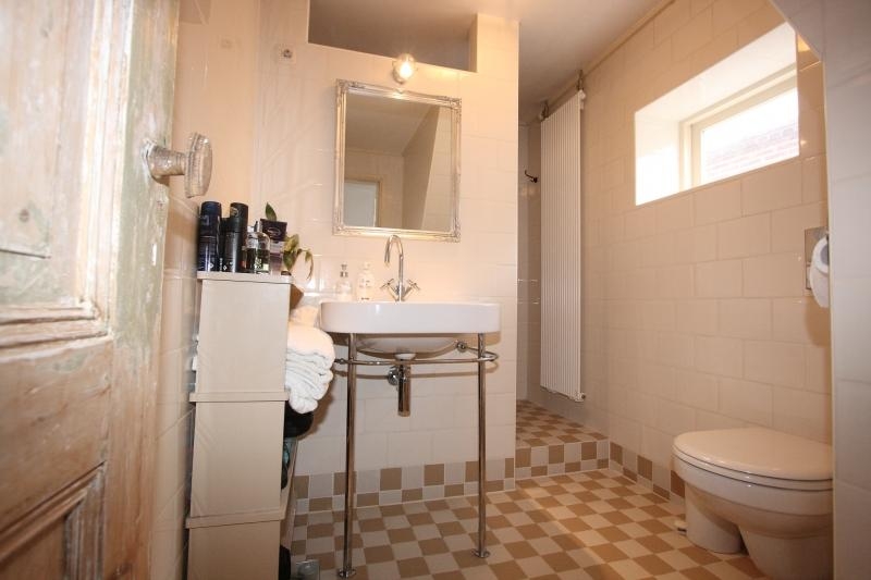 De volledig betegelde badkamer is in ca. 2004 aangelegd en voorzien van een geblokte tegelvloer, charmante wastafel, inloopdouche, hangend toilet en een design radiator.
