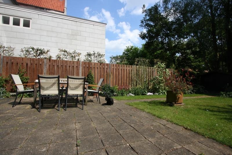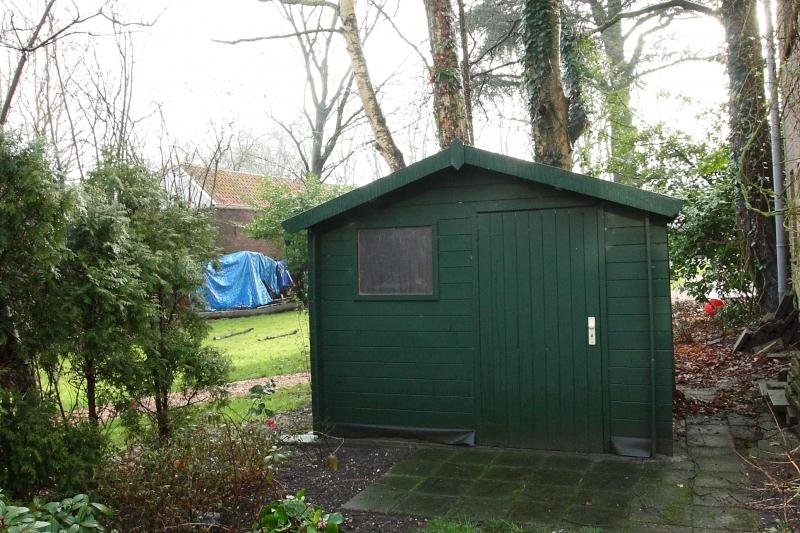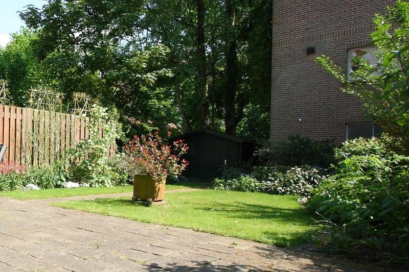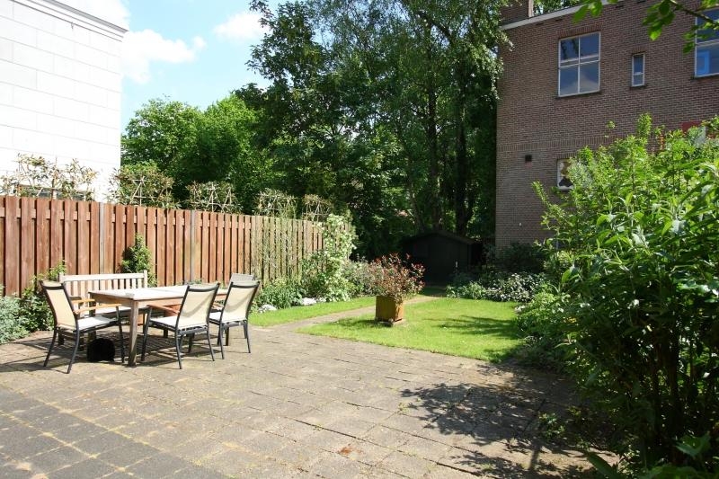 Achter de woning ligt een diepe tuin op het zuiden met een achterom. Met een terras direct achter de woning en verder een gazon, diverse borders, hagen, struiken en achterin de tuin een houten berging.