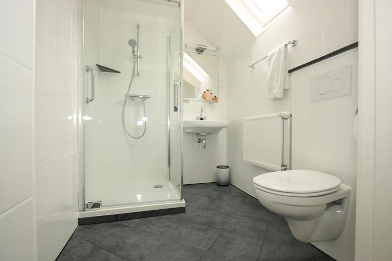 De nieuwe badkamer ( 2016) is voorzien van een dakraam, douchecabine, wastafel en 3e (hangend) toilet.
