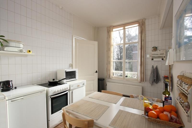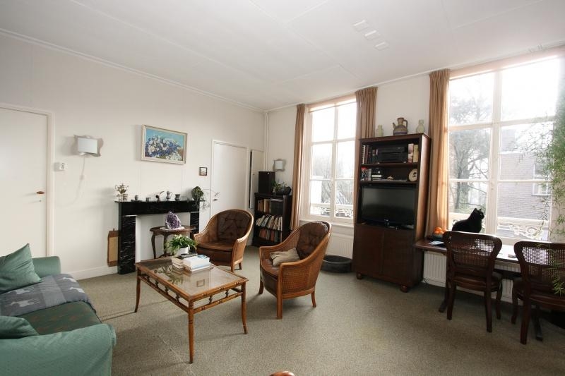 De woonkamer op de 2e verdieping (22 m2;) is voorzien van een originele schouw, inbouwkasten, 2 grote openslaande ramen met roedeverdeling en een deur naar de 2e (eenvoudige) keuken. In de keuken met tevens een groot raam is een keukenblok met spoelbak, losse keukenapparatuur en een inbouwkast.