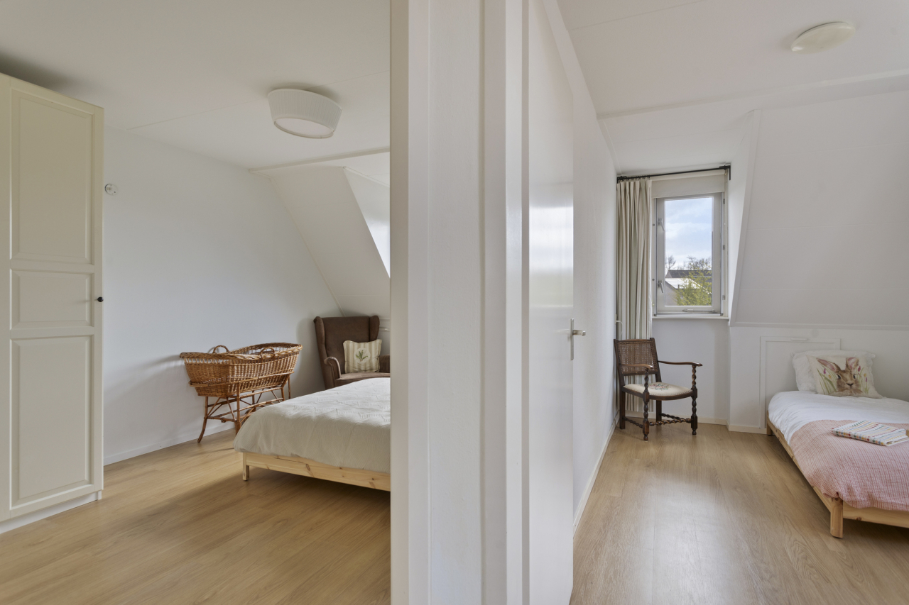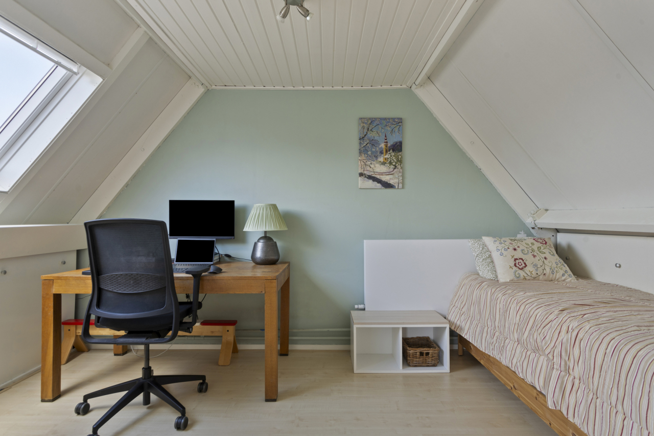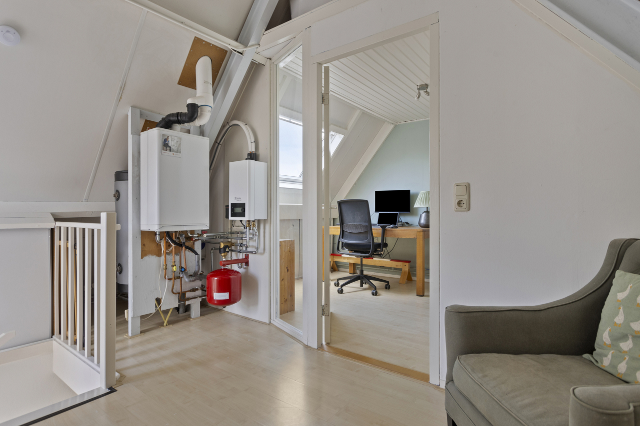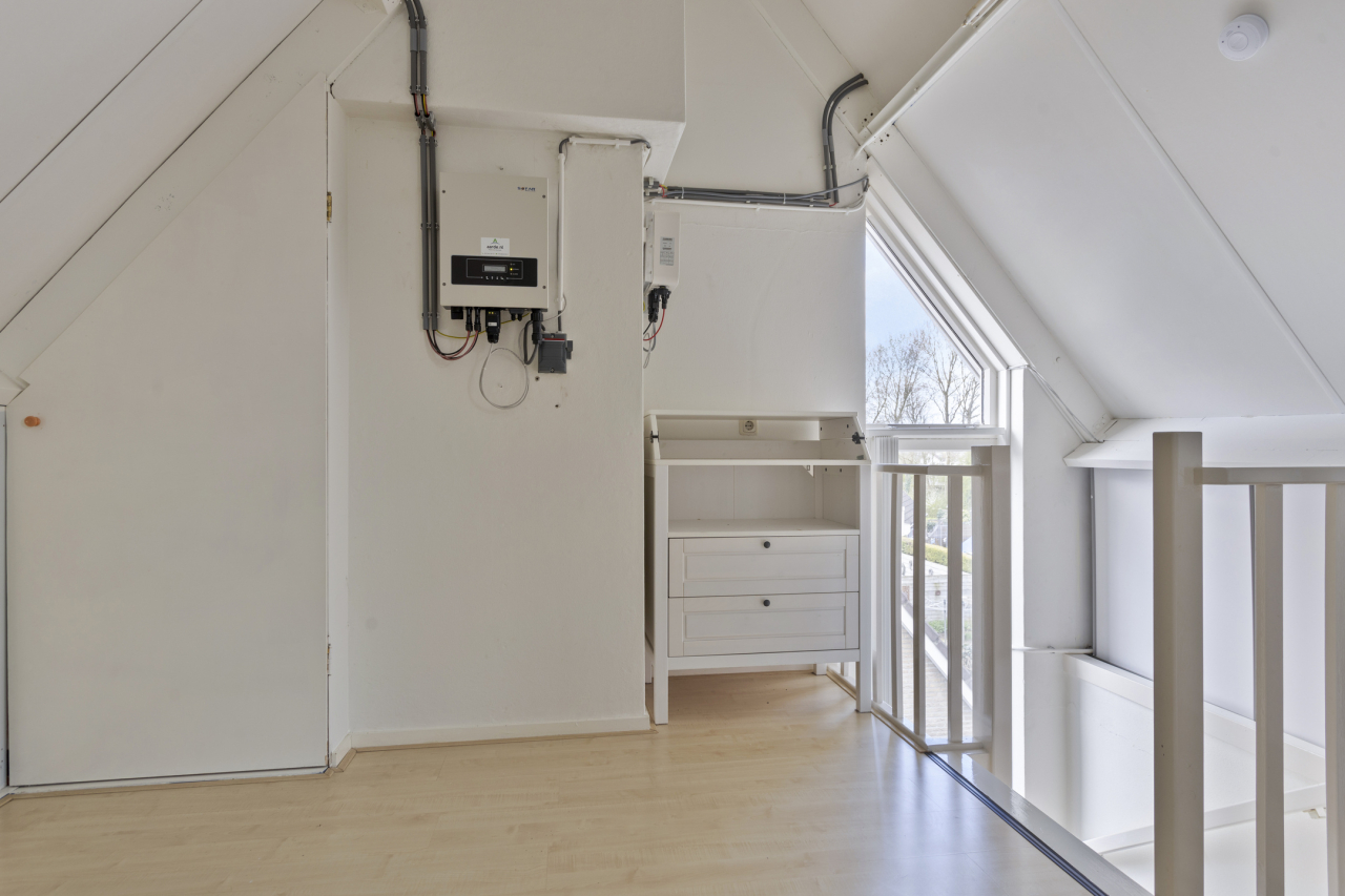 Op de 2e verdieping is de 4e slaapkamer met bergvliering, groot Veluxraam en knieschotten. Verder de voorzolder met inbouwkast, knieschotten en de Remeha Elga Ace hybride warmtepomp (2022), Intergas CV HR (2021) combiketel. Mechanische ventilatie unit en omvormers (2 x) van in totaal 22 zonnepanelen (2022).