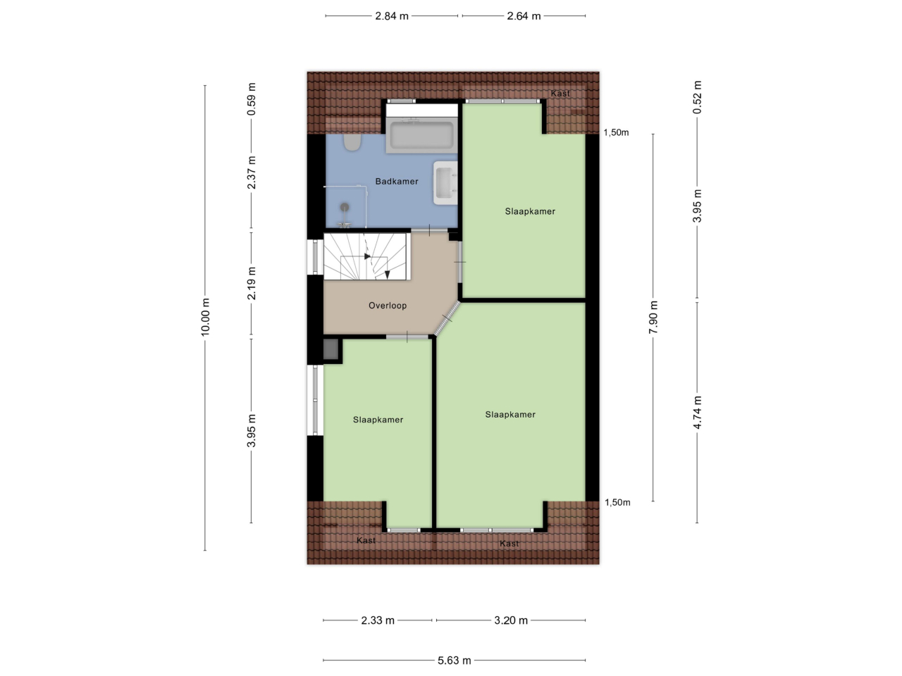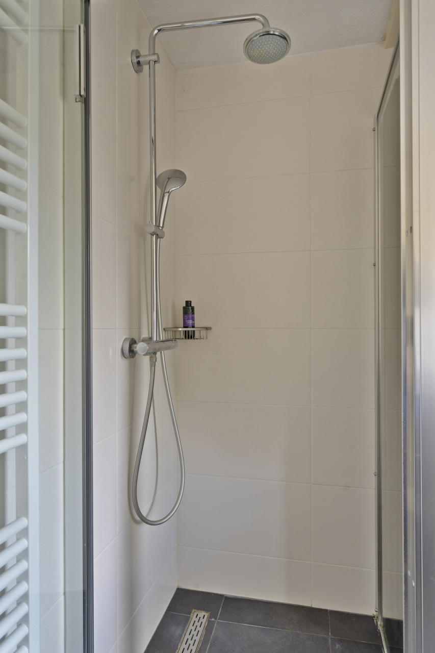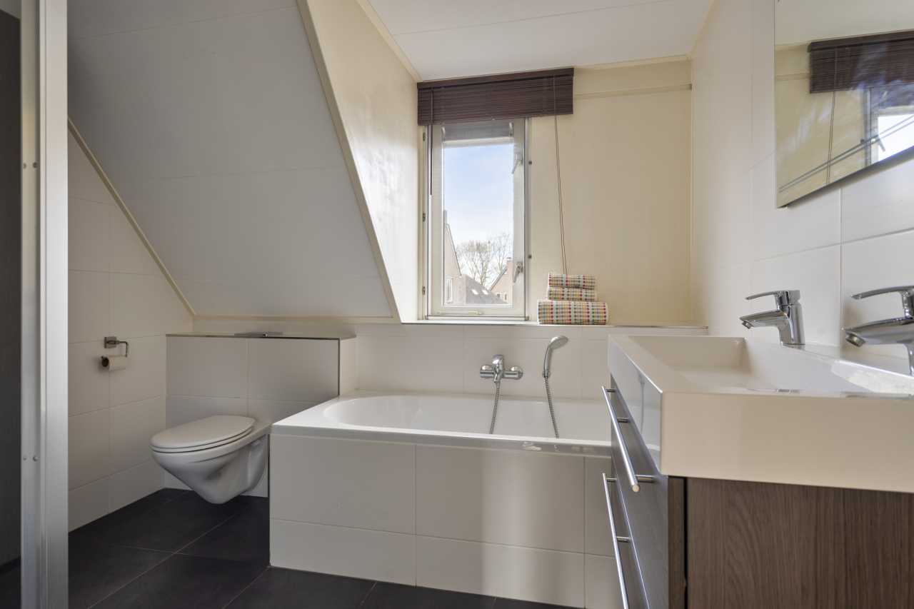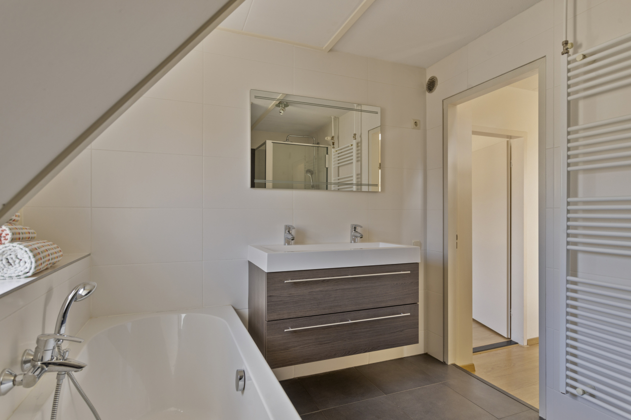 Via de hal is de 1e verdieping bereikbaar. Hier liggen aan de overloop 3 ruime slaapkamers met een laminaatvloer en tevens zuinige lage temperatuur radiatoren. Er is aan de voor en achterzijde een dakkapel die zorgt voor extra leefruimte. De ramen zijn voorzien van elektrisch bedienbare rolluiken. Aan de voorzijde liggen 2 slaapkamers en aan de achterzijde de 3e slaapkamer en de complete, moderne badkamer. Aan de voorzijde ligt naast de ouderslaapkamer de 2e slaapkamer. Deze slaapkamer is voorzien van een extra zijraam en elektrisch rolluik. De 3e slaapkamer ligt aan de achterzijde en is tevens voorzien van een elektrisch rolluik. De volledig betegelde lichte badkamer is ingericht met een ligbad, dubbel wastafelmeubel, designradiator, 2e hangend toilet en inloop douche met regendouche en handdouche.