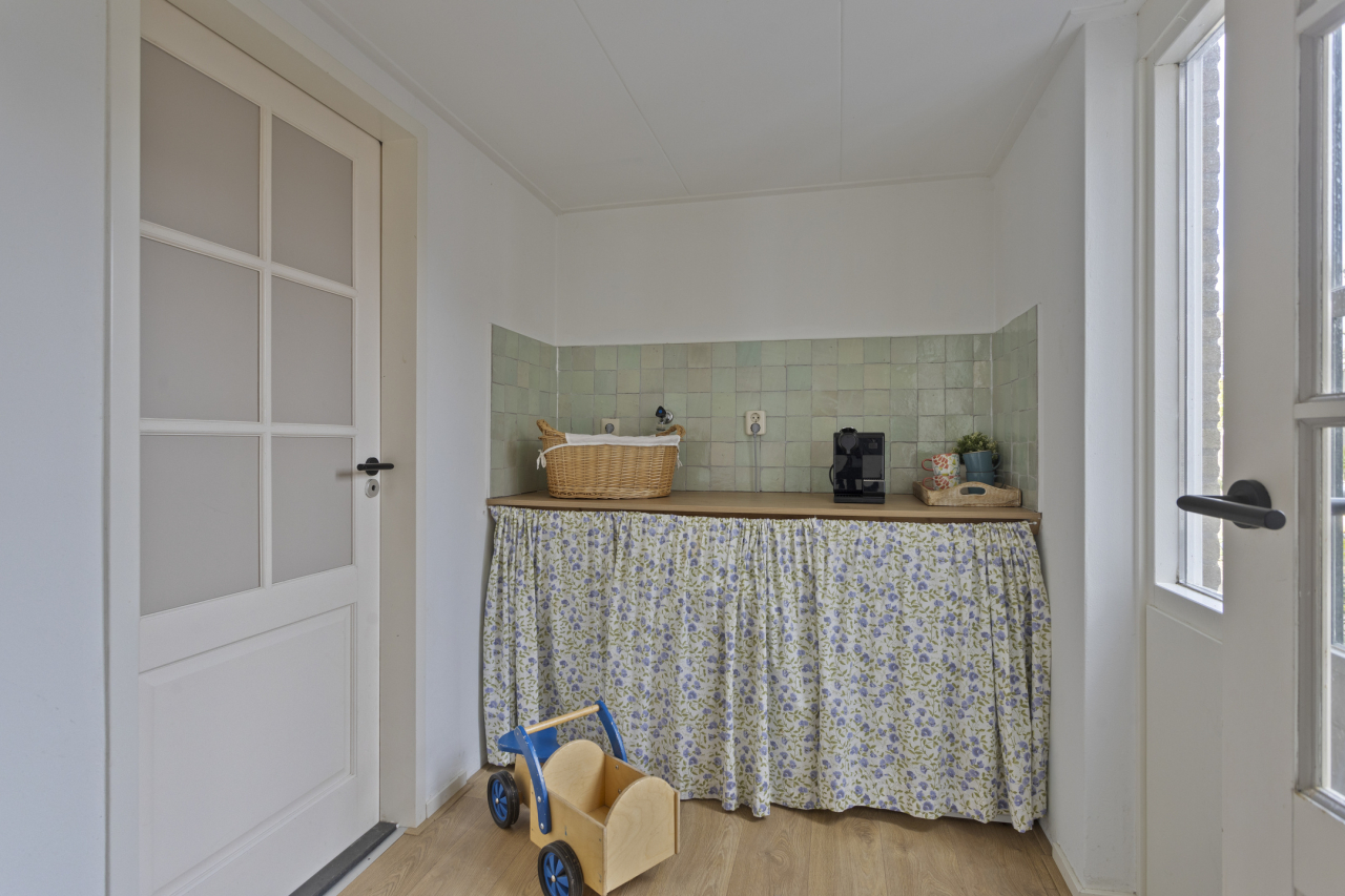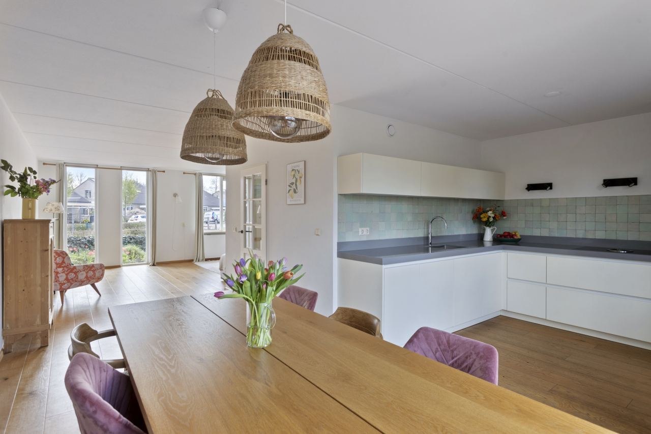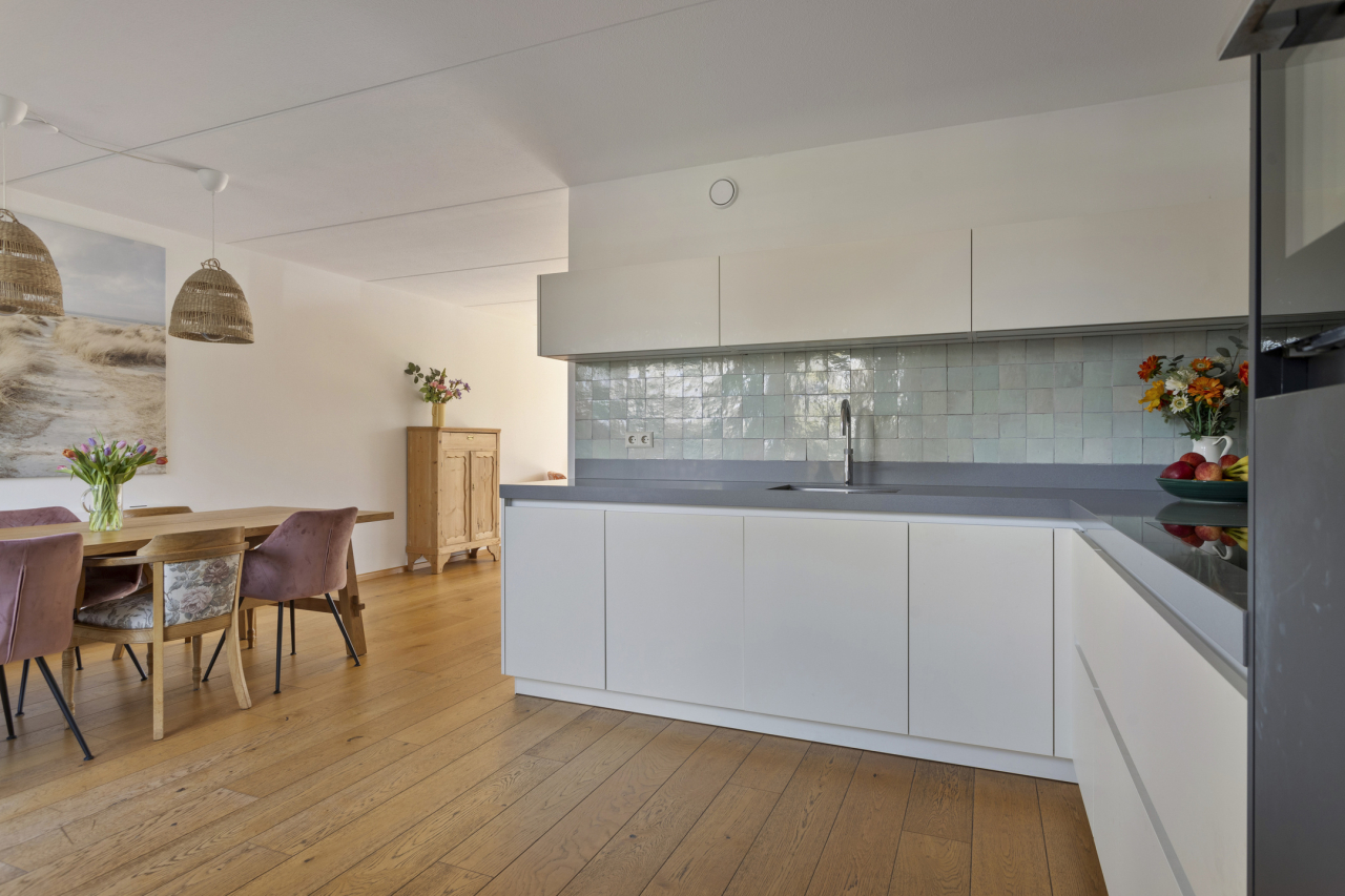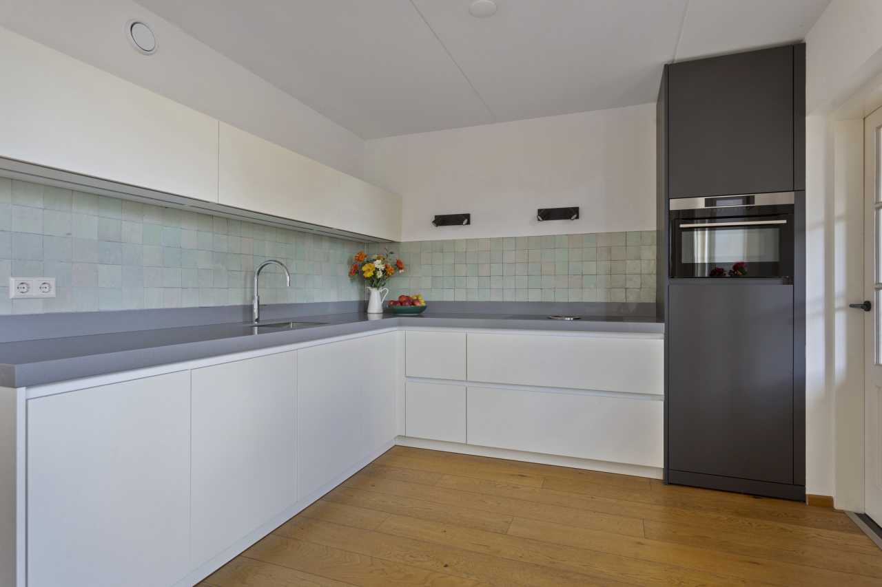 Aan de achterzijde is de moderne open keuken. Deze is voorzien van een composiet aanrechtblad met spoelbak en diverse luxe inbouwapparatuur zoals een Bora inductie kookplaat met geïntegreerde afzuiging, Siemens vaatwasser en – koelkast, AEG combi ovenmagnetron en een Quooker. Aansluitend is de bijkeuken met de witgoedaansluitingen en deur naar de garage en tuin.