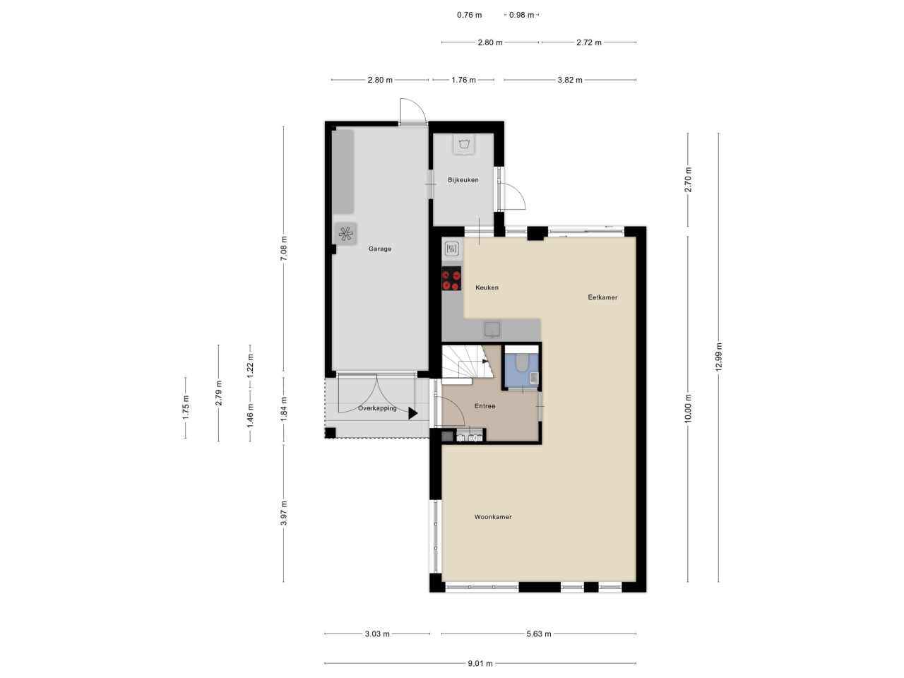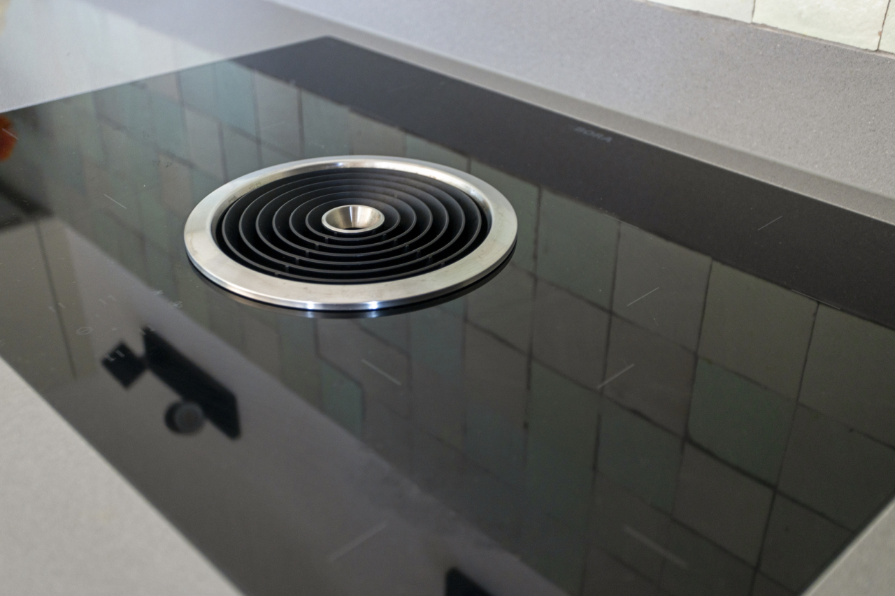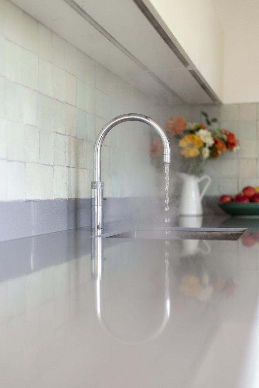 Aan de achterzijde is de moderne open keuken. Deze is voorzien van een composiet aanrechtblad met spoelbak en diverse luxe inbouwapparatuur zoals een Bora inductie kookplaat met geïntegreerde afzuiging, Siemens vaatwasser en – koelkast, AEG combi ovenmagnetron en een Quooker. Aansluitend is de bijkeuken met de witgoedaansluitingen en deur naar de garage en tuin.