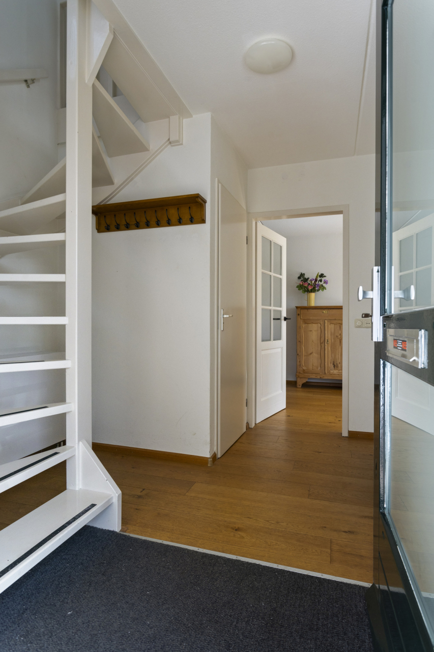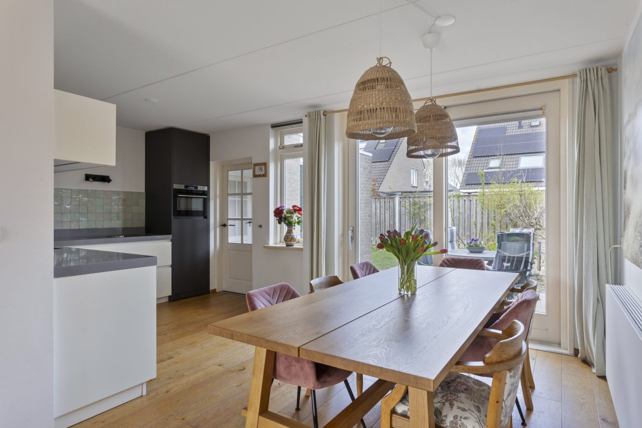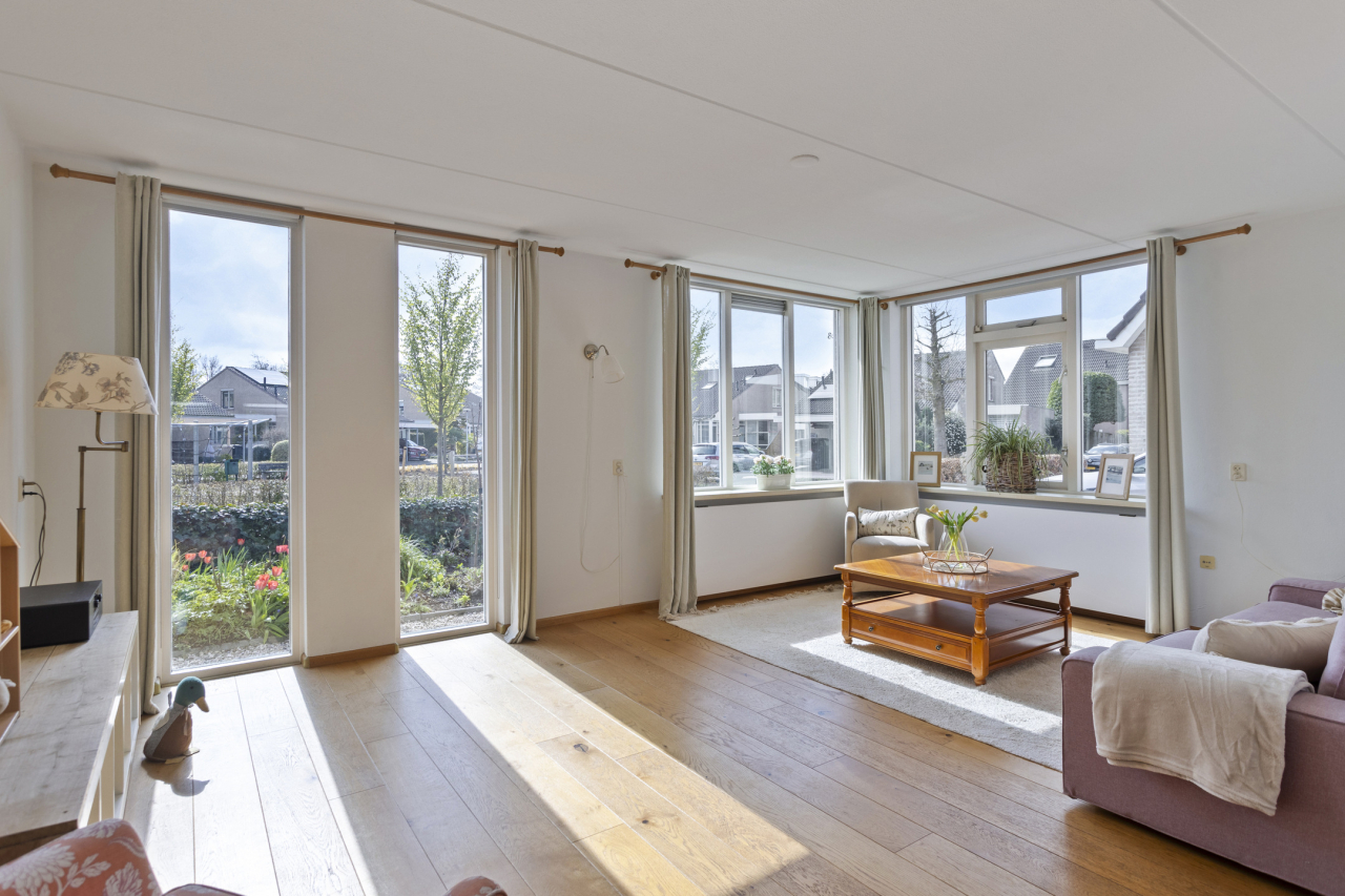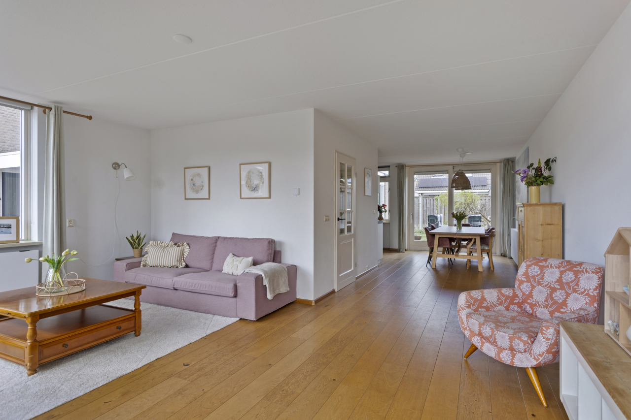 Vanuit de hal met garderobe, trapopgang, meterkast en toilet met fonteintje zijn de woonkamer en keuken bereikbaar. De woonkamer is voorzien van energiezuinige, lage temperatuur radiatoren, een licht lamelparket vloer en veel ramen, die zorgen voor extra lichtinval. Aan de voorzijde is de zithoek en aan de achterzijde de eethoek met schuifpui en zicht op de groene tuin.