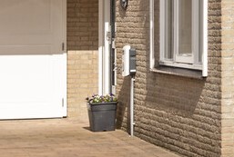 De overdekte entree van de woning is aan de voorzijde naast de oprit naar de garage met dubbele deuren en eigen laadpaal.