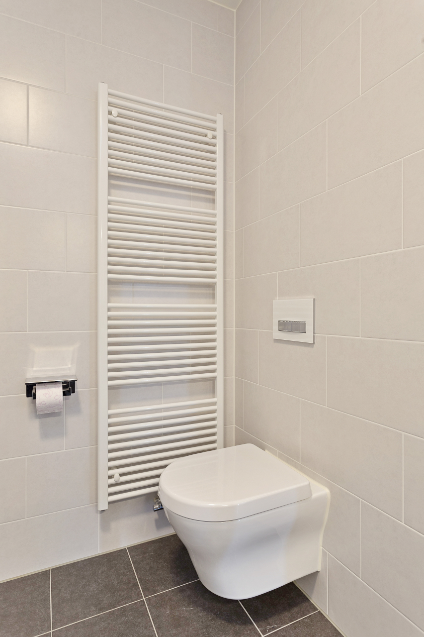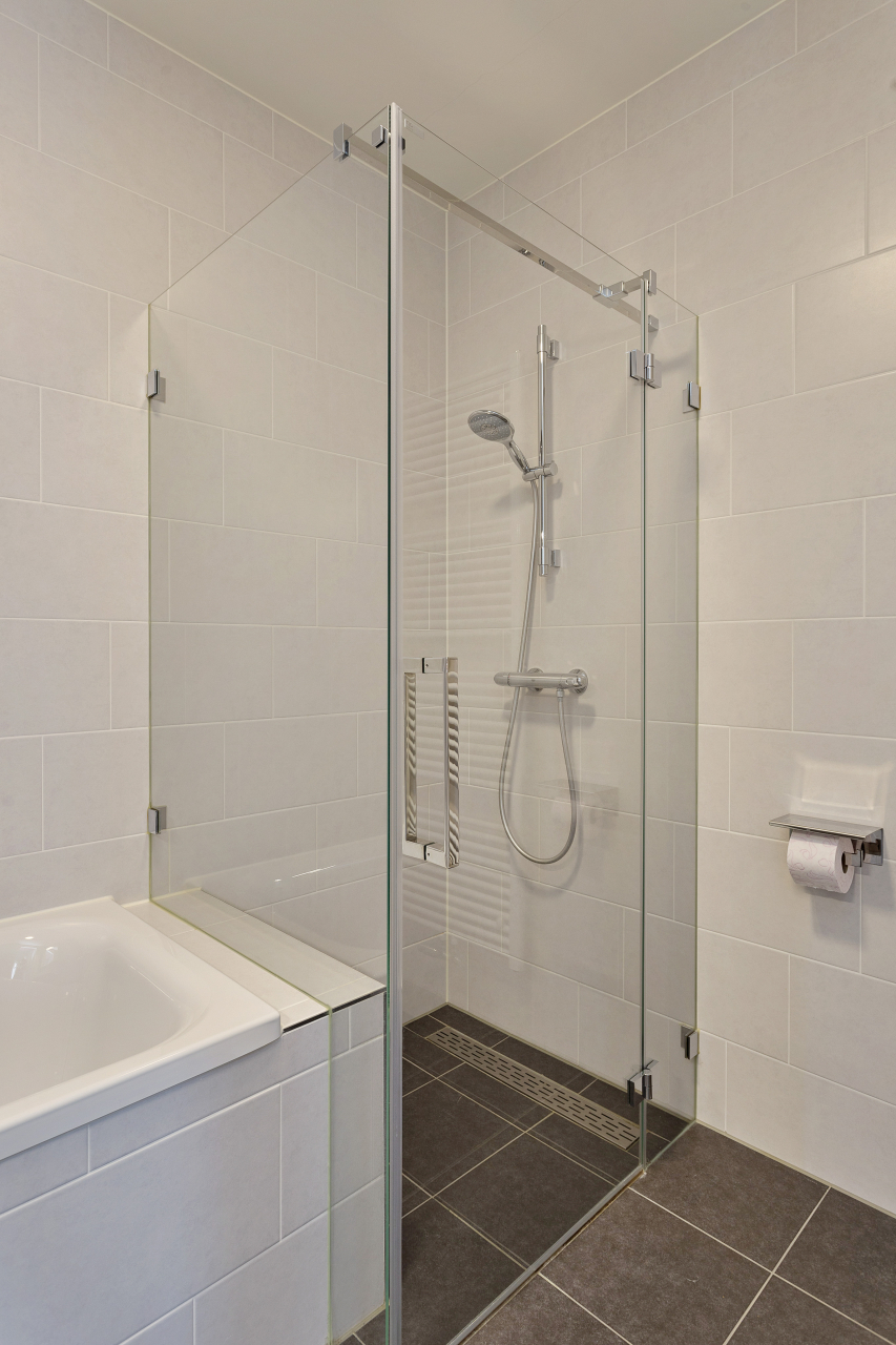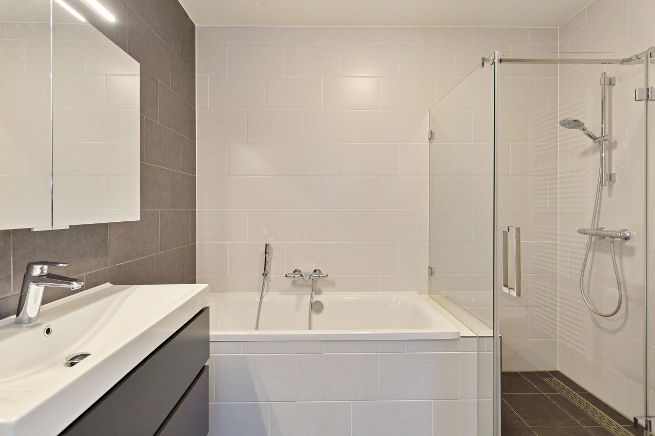 De lichte badkamer, volledig betegeld is voorzien van een ligbad en aparte inloopdouche beiden met thermostaatkraan. Verder is er een breed wastafelmeubel en 2e toilet.