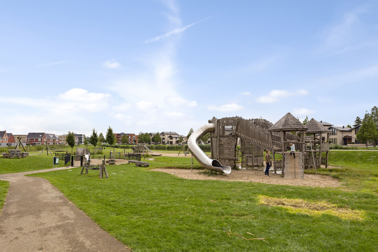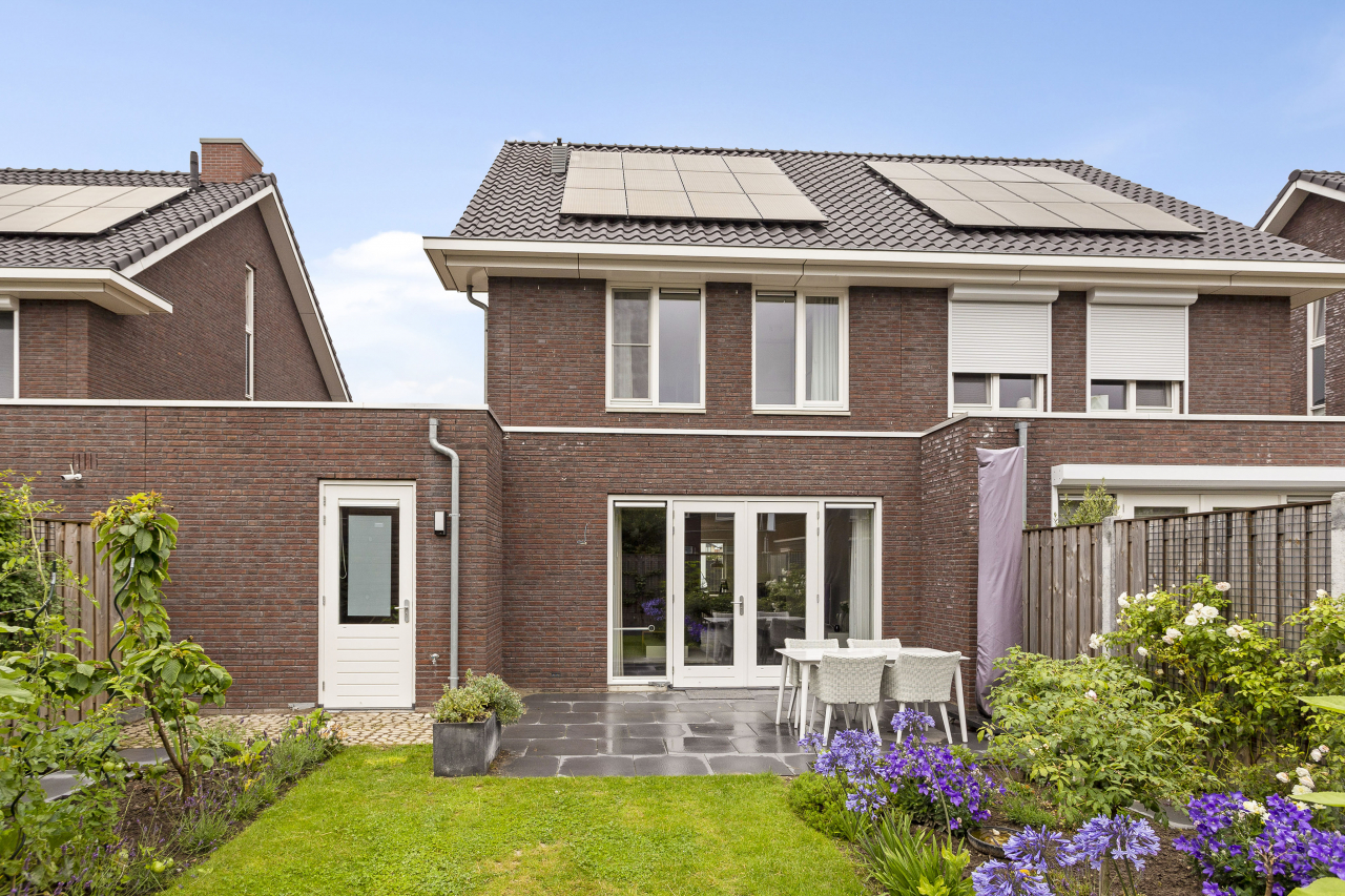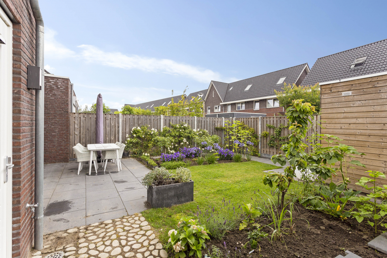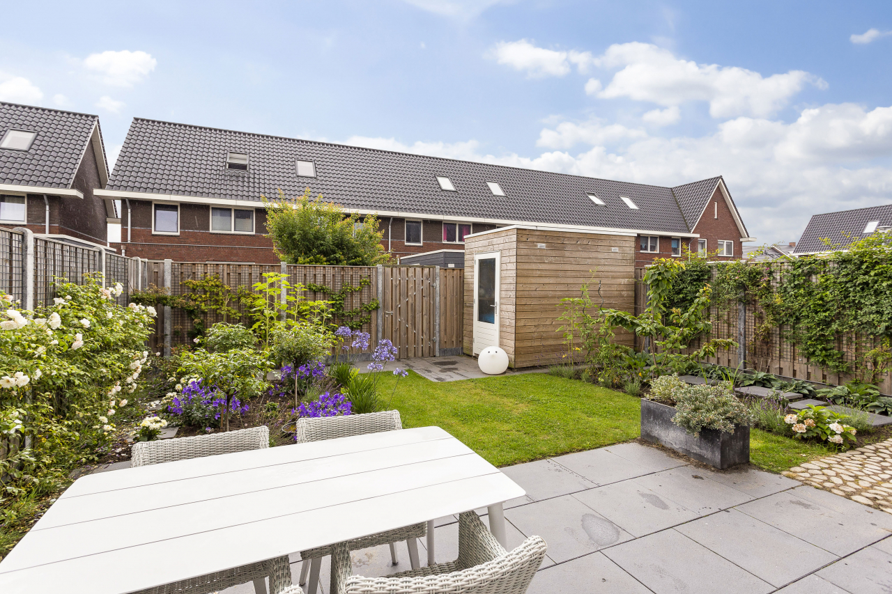 Achter de woning ligt een prachtige groene tuin met achterom, gazon en een groot terras direct achter de woning. De tuin is bereikbaar via de garage en de openslaande deuren in de woonkamer. Verder is de tuin voorzien van sierbestrating, borders, struiken en een praktische, houten berging. Komt u kijken ?