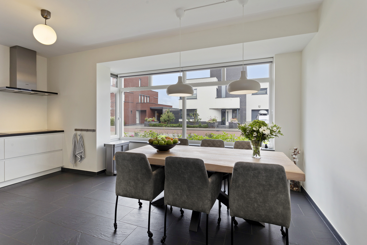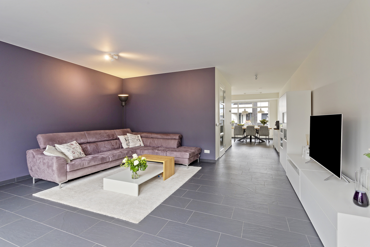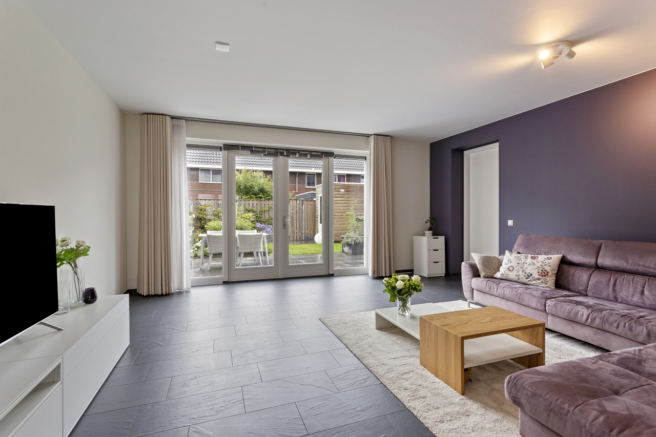 De L-vormige, uitgebouwde, ruime woonkamer met zithoek aan de achterzijde en sfeervolle erker aan de voorzijde, is ook voorzien van comfortabele vloerverwarming. Aan de voorzijde is de open keuken en aan de achterzijde openslaande deuren naar het terras en een deur naar de inpandig bereikbare garage.