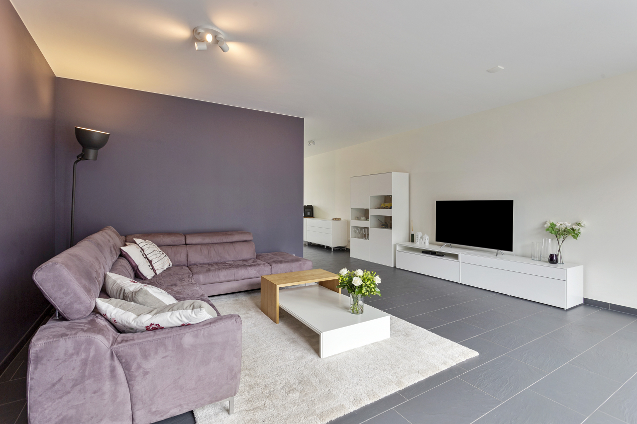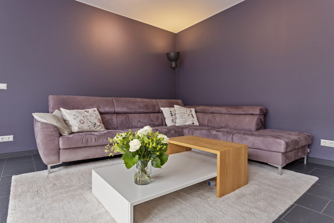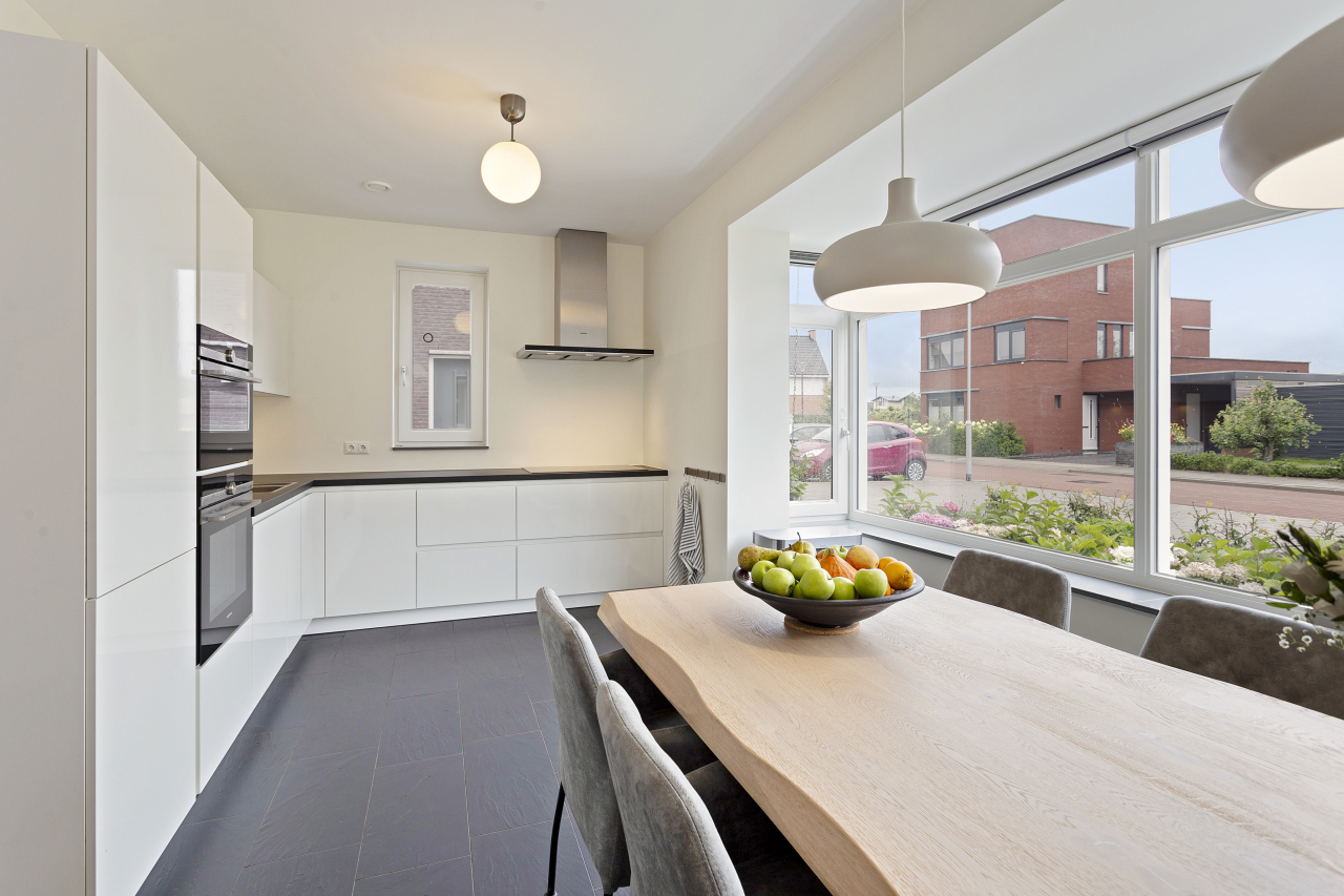 De L-vormige, uitgebouwde, ruime woonkamer met zithoek aan de achterzijde en sfeervolle erker aan de voorzijde, is ook voorzien van comfortabele vloerverwarming. Aan de voorzijde is de open keuken en aan de achterzijde openslaande deuren naar het terras en een deur naar de inpandig bereikbare garage.