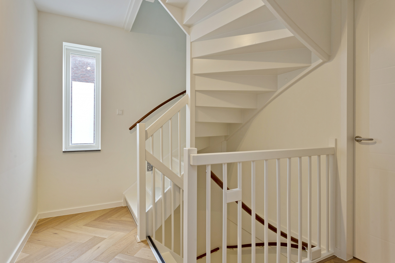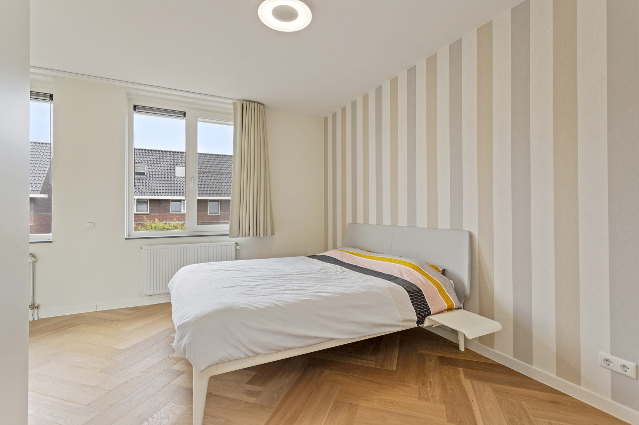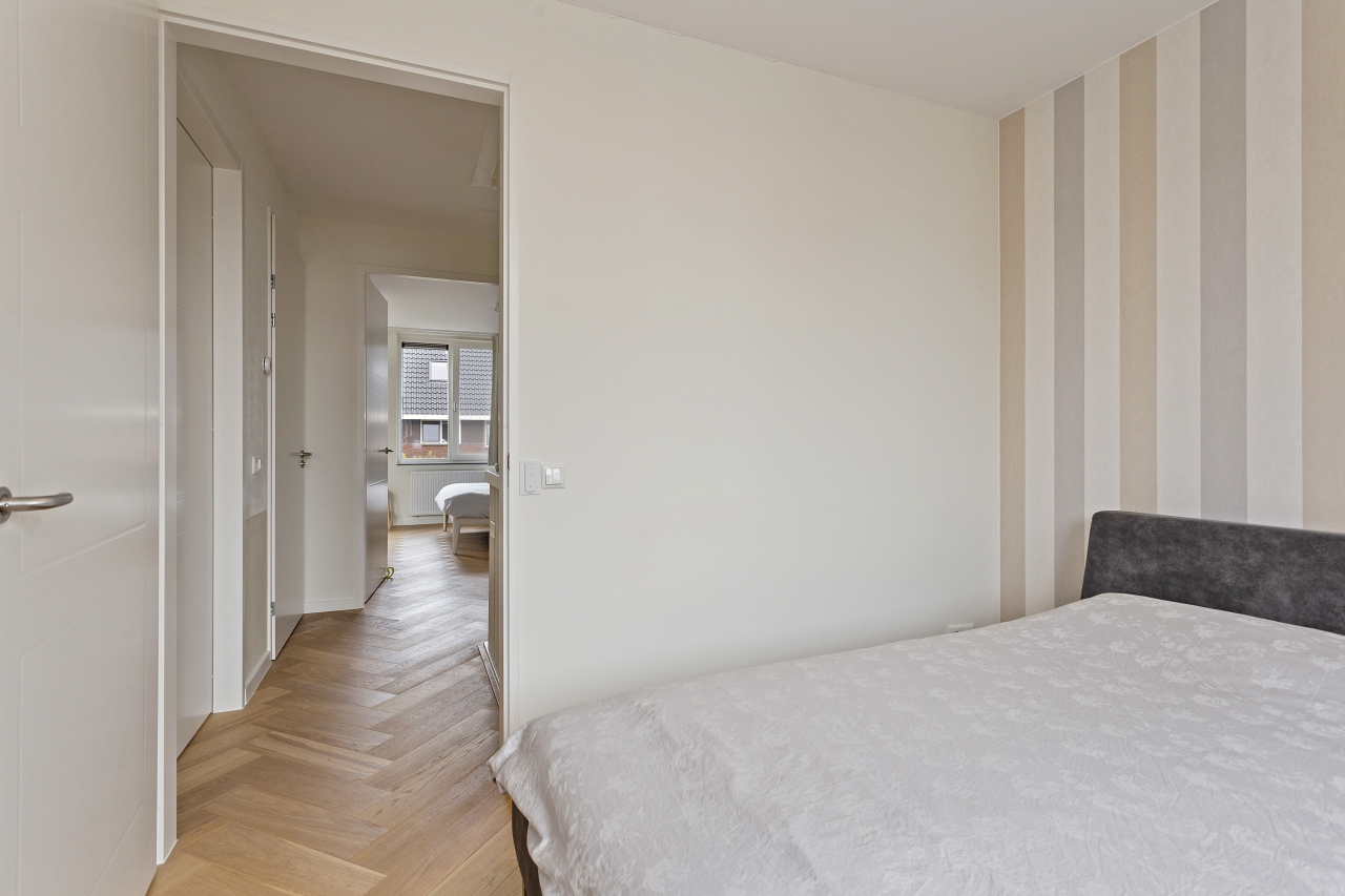 Op de eerste verdieping liggen 3 slaapkamers en de complete badkamer. Aan de voorzijde 2 slaapkamers en aan de achterzijde de ouderslaapkamer. De volledige verdieping is voorzien van een fraaie eiken visgraat parketvloer.