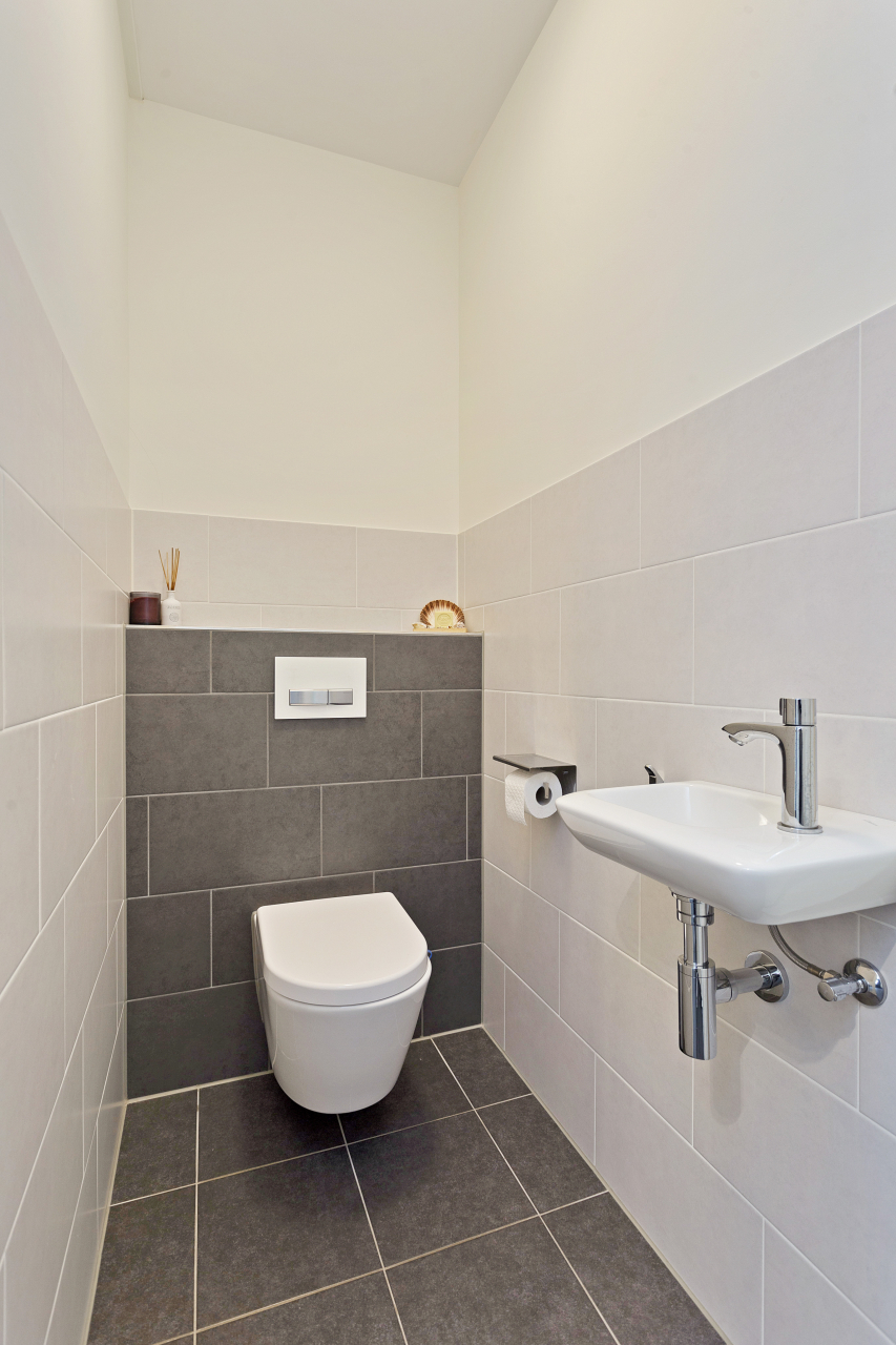 De hal en toilet zijn voorzien van een mooie donkergrijze tegelvloer met vloerverwarming.