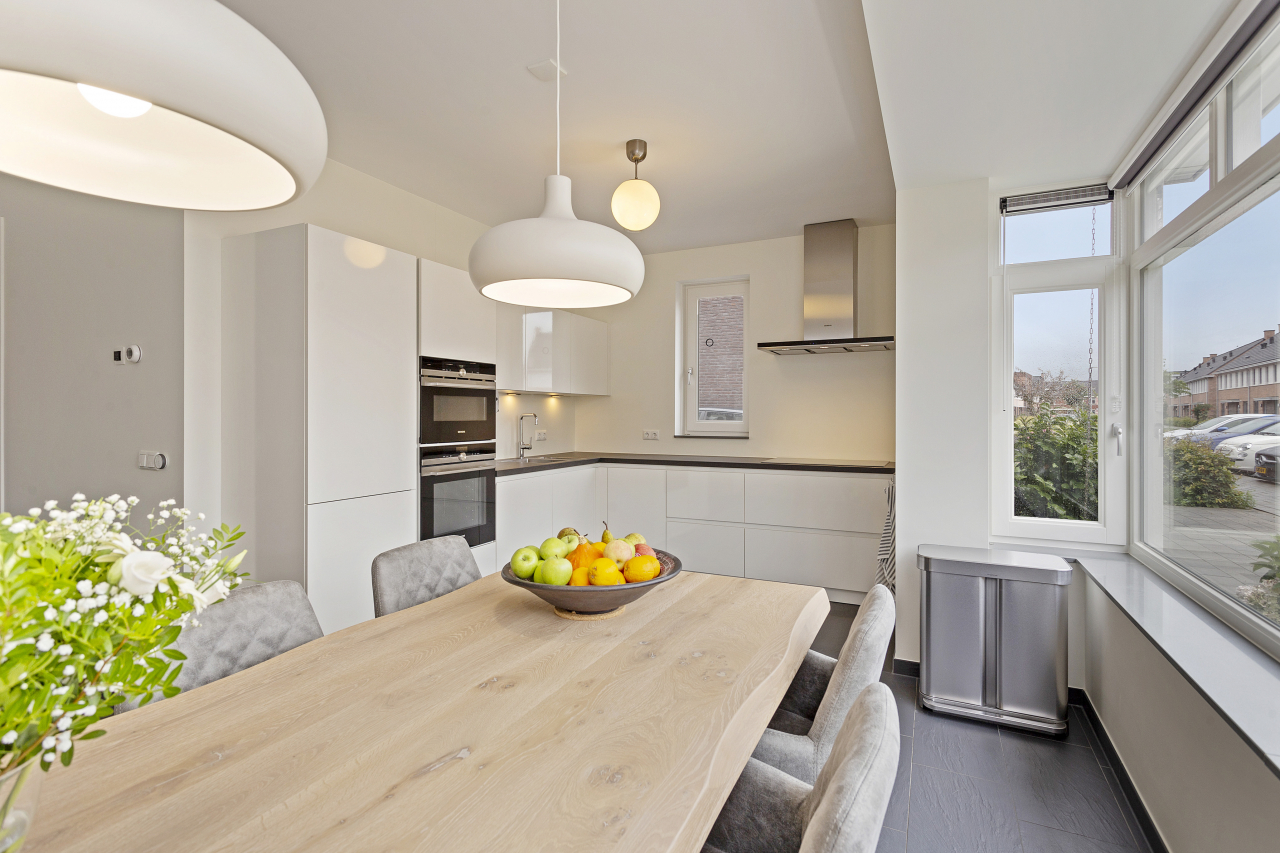 Aan de voorzijde bij de eethoek en erker is de luxe open keuken met een L-vormig aanrechtblad met 1,5 spoelbak en diverse inbouwapparatuur zoals een Siemens 5-pits inductie kookplaat met Siemens afzuigschouw, Siemens oven, Siemens magnetron, Siemens koelvriescombinatie en - vaatwasser.